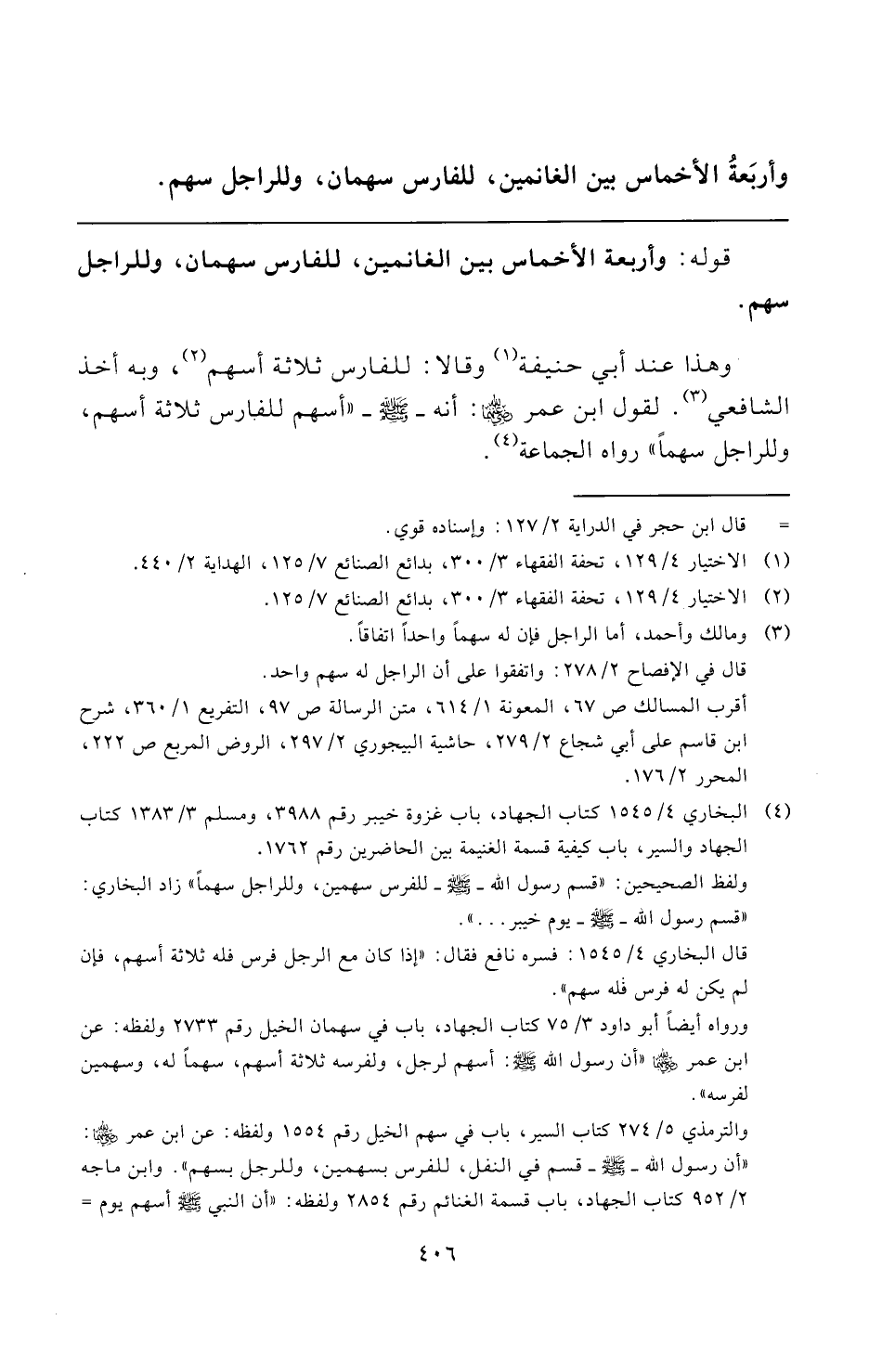 (¬٤) البخاري ٤/ ١٥٤٥ كتاب الجهاد، باب غزوة خيبر رقم ٣٩٨٨، ومسلم ٣/ ١٣٨٣ كتاب الجهاد والسير، باب كيفية قسمة الغنيمة بين الحاضرين رقم ١٧٦٢.