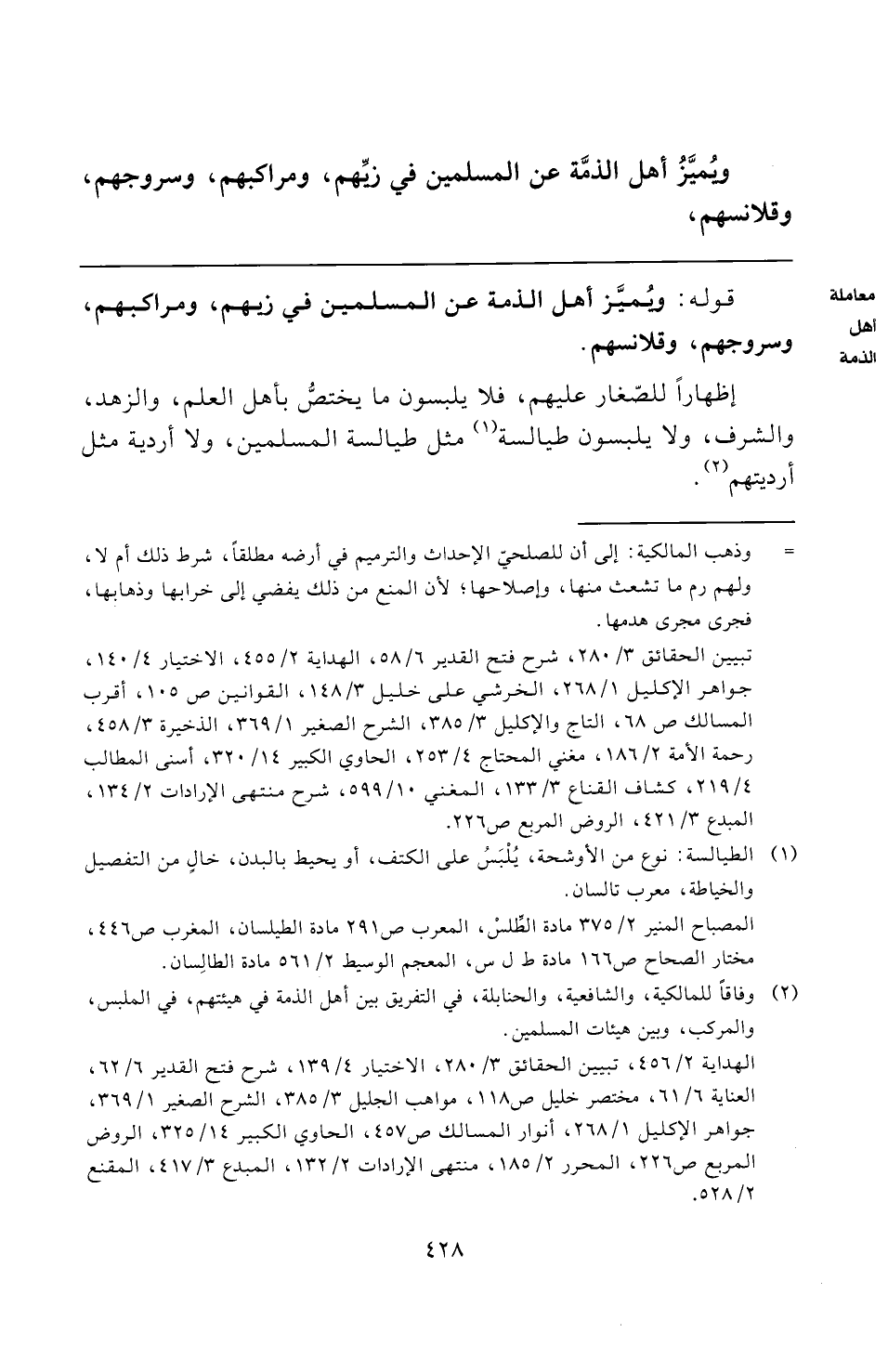 (¬٢) وفاقًا للمالكية، والشافعية، والحنابلة، في التفريق بين أهل الذمة في هيئتهم، في الملبس، والمركب، وبين هيئات المسلمين.
