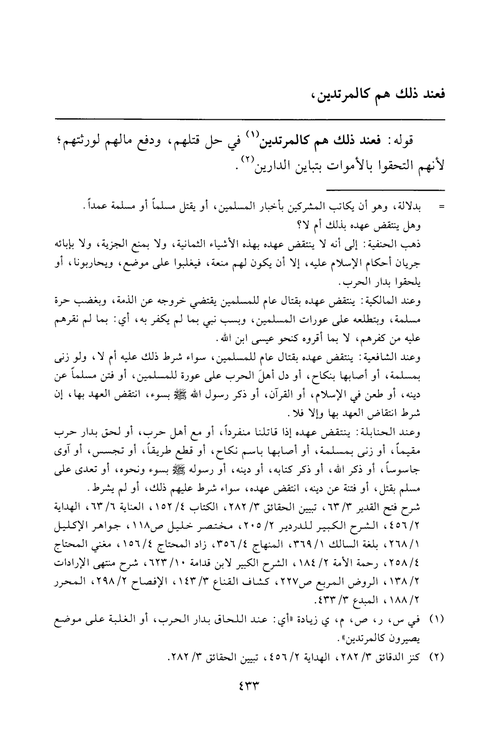 (¬١) في س، ر، ص، م، ي زيادة "أي: عند اللحاق بدار الحرب، أو الغلبة على موضع يصيرون كالمرتدين".