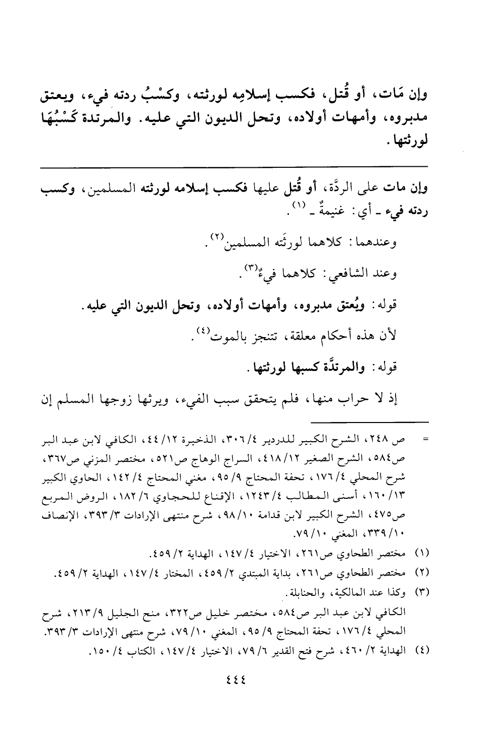 وإن مَات، أو قُتل، فكسب إسلامِه لورثته، وكسْبُ ردته فيء، ويعتق مدبروه، وأمهات أولاده، وتحل الديون التي عليه. والمرتدة كَسْبُهَا لورثتها.