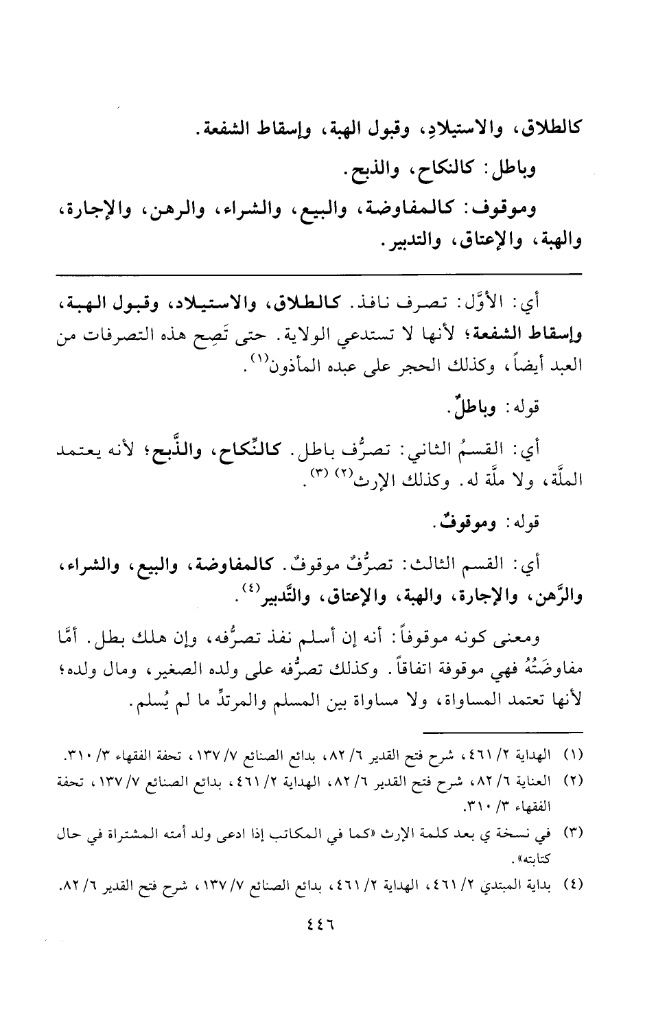 (¬٢) العناية ٦/ ٨٢، شرح فتح القدير ٦/ ٨٢، الهداية ٢/ ٤٦١، بدائع الصنائع ٧/ ١٣٧، تحفة الفقهاء ٣/ ٣١٠.