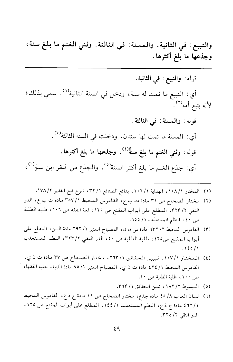 (¬٣) القاموس المحيط ٢/ ٦٣٢ مادة س ن ن، المصباح المنير ١/ ٢٩٢ مادة السن، المطلع على أبواب المقنع ص ١٢٥، طلبة الطلبة ص ٤٠، الدر النقي ٢/ ٣٢٣، النظم المستعذب ١/ ١٤٥.