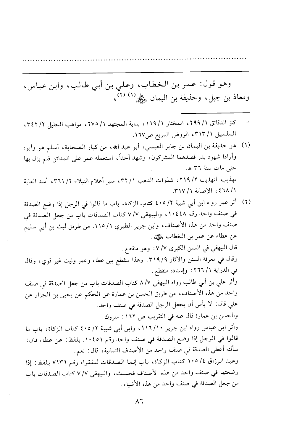 وأثر علي بن أبي طالب رواه البيهقي ٧/ ٨ كتاب الصدقات باب من جعل الصدقة في صنف واحد من هذه الأصناف، من طريق الحسن بن عمارة عن الحكم عن يحيى بن الجزار عن علي قال: لا بأس أن يجعل الرجل الصدقة في صنف واحد.