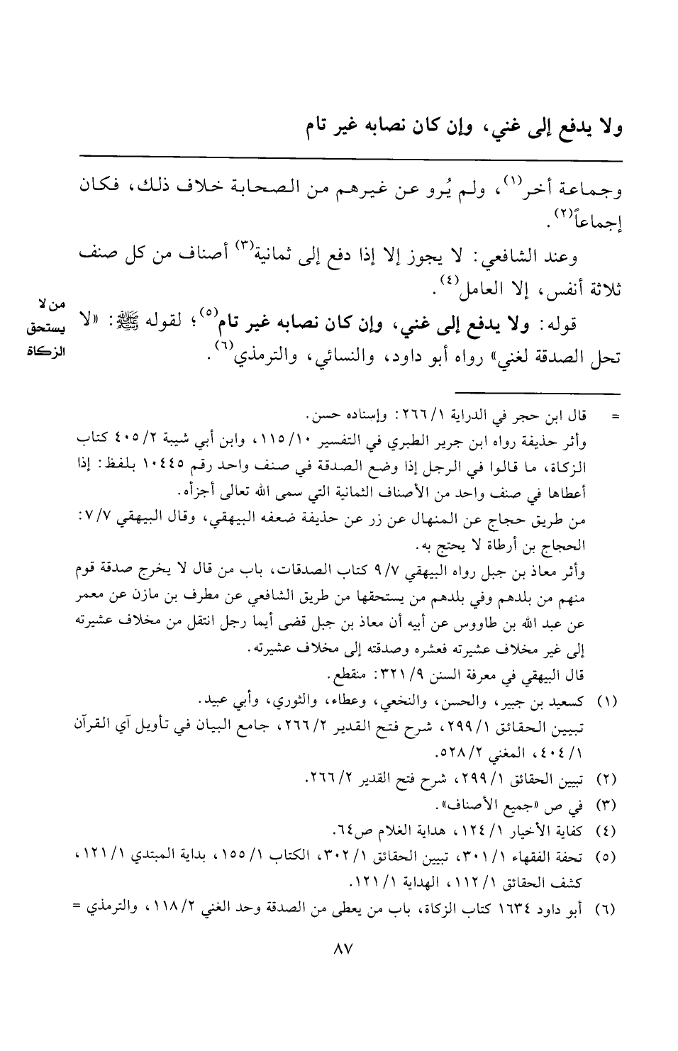 قوله: ولا يدفع إلى غني، وإن كان نصابه غير تام (¬٥)؛ لقوله -صلى الله عليه وسلم-: "لا تحل الصدقة لغني" رواه أبو داود، والنسائي، والترمذي (¬٦).