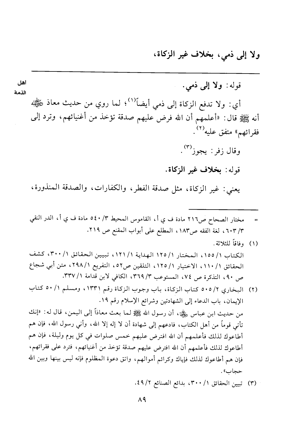 أي: ولا تدفع الزكاة إلى ذمي أيضًا (¬١)؛ لما روي من حديث معاذ -رضي الله عنه- أنه -صلى الله عليه وسلم- قال: "أعلمهم أن الله فرض عليهم صدقة تؤخذ من أغنيائهم، وترد إلى فقرائهم" متفق عليه (¬٢).