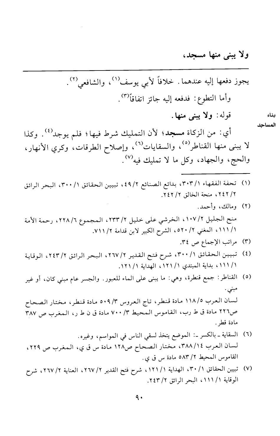 أي: من الزكاة مسجد؛ لأن التمليك شرط فيها؛ فلم يوجد (¬٤). وكذا لا يبنى منها القناطر (¬٥)، والسقايات (¬٦)، وإصلاح الطرقات، وكري الأنهار، والحج، والجهاد، وكل ما لا تمليك فيه (¬٧).