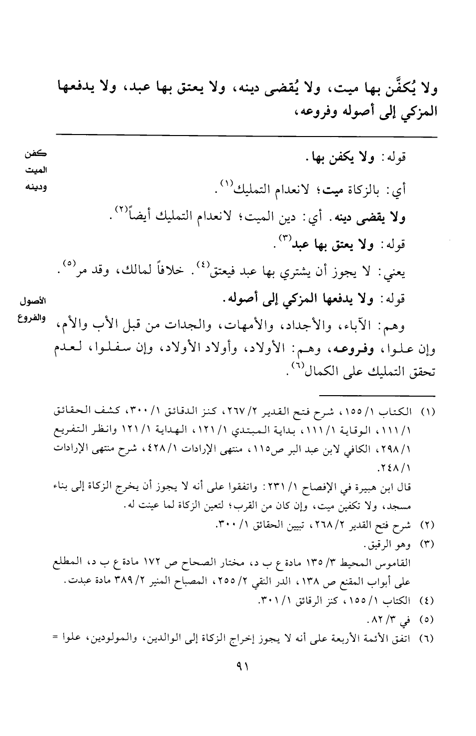 ولا يُكفَّن بها ميت، ولا يُقضى دينه، ولا يعتق بها عبد، ولا يدفعها المزكي إلى أصوله وفروعه،