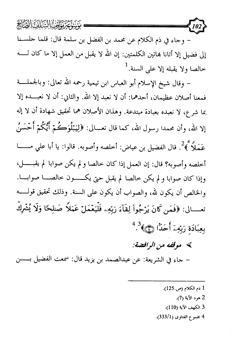 - وجاء في ذم الكلام عن محمد بن الفضل بن سلمة قال: قلما جلسنا إلى فضيل إلا أتانا بهاتين الكلمتين: إن الله لا يقبل من العمل إلا ما كان له خالصا ولا يقبله إلا على السنة. (¬1)