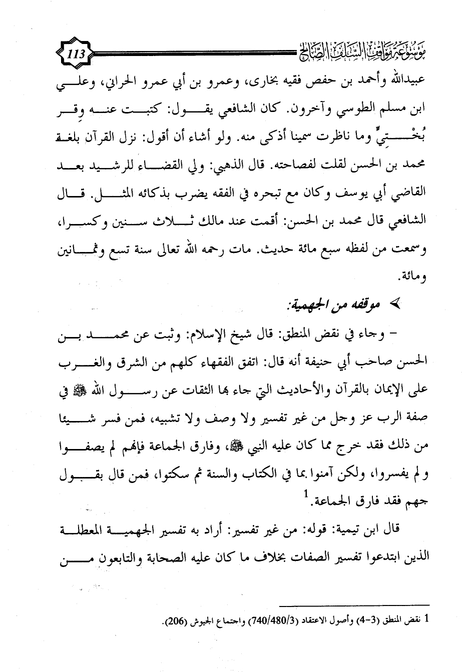 - وجاء في نقض المنطق: قال شيخ الإسلام: وثبت عن محمد بن الحسن صاحب أبي حنيفة أنه قال: اتفق الفقهاء كلهم من الشرق والغرب على الإيمان بالقرآن والأحاديث التي جاء بها الثقات عن رسول الله - صلى الله عليه وسلم - في صفة الرب عز وجل من غير تفسير ولا وصف ولا تشبيه، فمن فسر شيئا من ذلك فقد خرج مما كان عليه النبي - صلى الله عليه وسلم -، وفارق الجماعة فإنهم لم يصفوا ولم يفسروا، ولكن آمنوا بما في الكتاب والسنة ثم سكتوا، فمن قال بقول جهم فقد فارق الجماعة. (¬1)