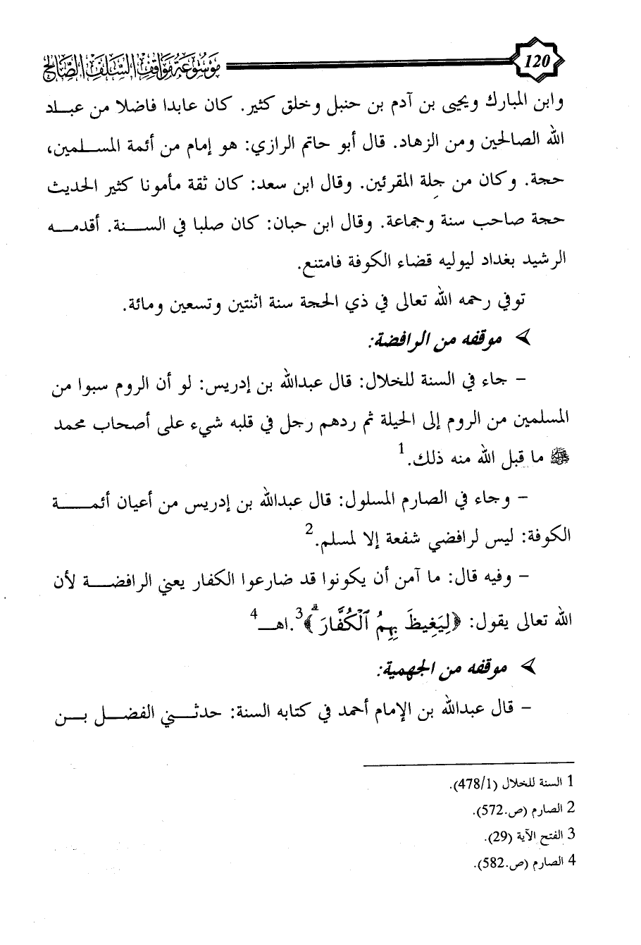 - وجاء في الصارم المسلول: قال عبد الله بن إدريس من أعيان أئمة الكوفة: ليس لرافضي شفعة إلا لمسلم. (¬2)
