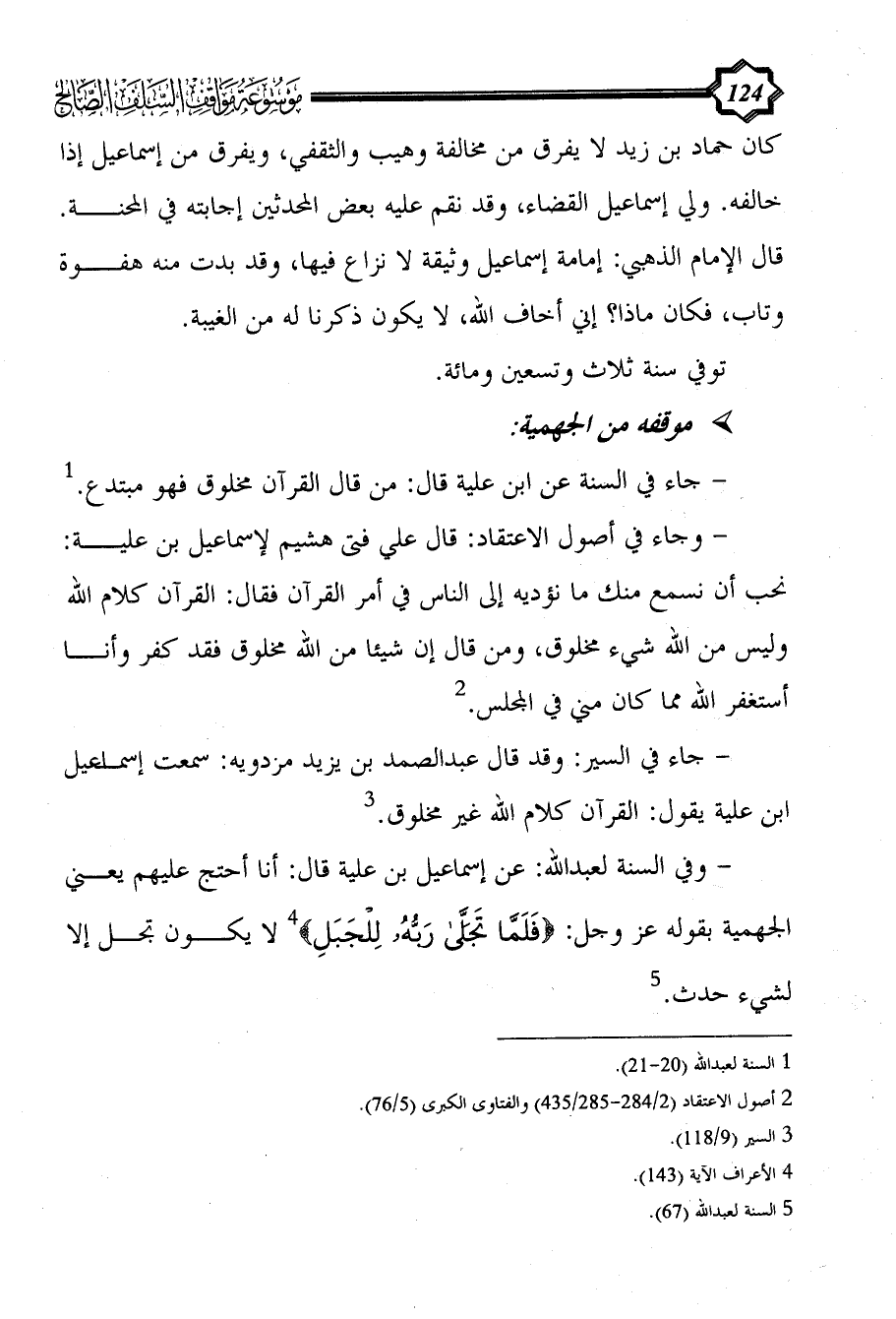 - جاء في السنة عن ابن علية قال: من قال القرآن مخلوق فهو مبتدع. (¬1)