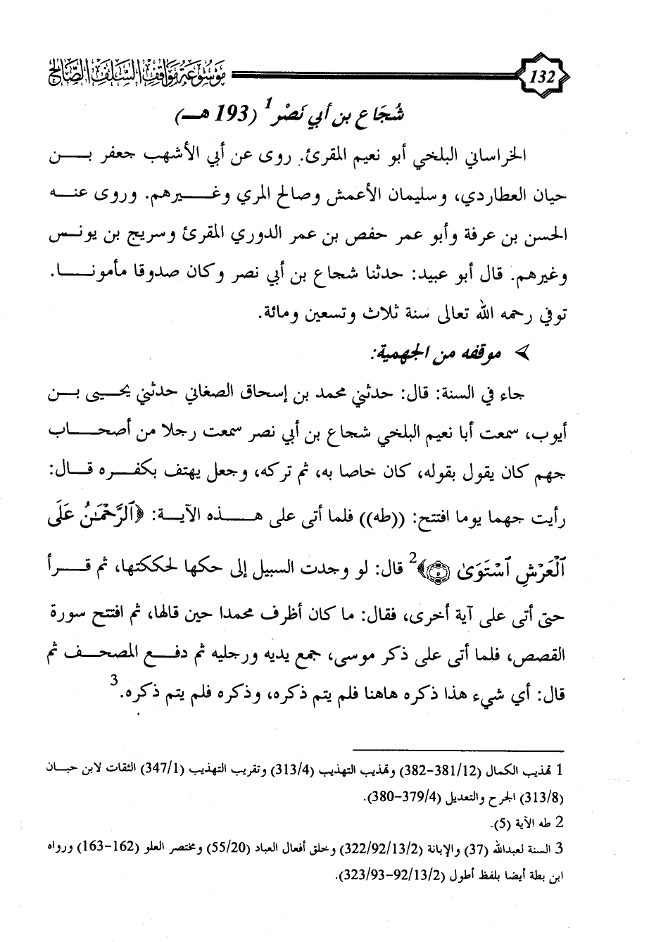 جاء في السنة: قال: حدثني محمد بن إسحاق الصغاني حدثني يحيى بن أيوب، سمعت أبا نعيم البلخي شجاع بن أبي نصر سمعت رجلا من أصحاب جهم كان يقول بقوله، كان خاصا به، ثم تركه، وجعل يهتف بكفره قال: رأيت جهما يوما افتتح: ((طه)) فلما أتى على هذه الآية: {الرَّحْمَنُ على العرش استوى} (¬2) قال: لو وجدت السبيل إلى حكها لحككتها، ثم قرأ حتى أتى على آية أخرى، فقال: ما كان أظرف محمدا حين قالها، ثم افتتح سورة القصص، فلما أتى على ذكر موسى، جمع يديه ورجليه ثم دفع المصحف ثم قال: أي شيء هذا ذكره هاهنا فلم يتم ذكره، وذكره فلم يتم ذكره. (¬3)