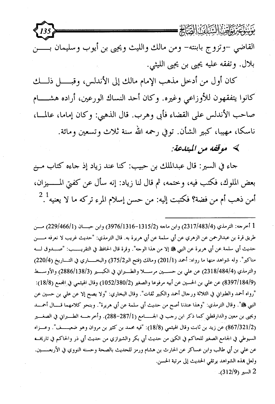 (¬1) أخرجه: الترمذي (4/ 483/2317) وابن ماجه (2/ 1315 - 1316/ 3976) وابن حبان (1/ 466/229) من طريق قرة بن عبد الرحمن عن الزهري عن أبي سلمة عن أبي هريرة به. قال الترمذي: "حديث غريب لا نعرفه من حديث أبي سلمة عن أبي هريرة عن النبي - صلى الله عليه وسلم - إلا من هذا الوجه". وقرة قال الحافظ في التقريب: "صدوق له مناكير". وله شواهد منها ما رواه: أحمد (1/ 201) ومالك (فتح البر2/ 375) والبخاري في التاريخ (4/ 220) والترمذي (4/ 484/2318) عن علي بن حسين مرسلا والطبراني في الكبير (3/ 138/2886) والأوسط (9/ 184/8397) عن علي بن الحسين عن أبيه مرفوعا والصغير (2/ 380/1052) وقال الهيثمي في المجمع (8/ 18): "رواه أحمد والطبراني في الثلاثة ورجال أحمد والكبير ثقات". وقال البخاري: "ولا يصح إلا عن علي بن حسين عن النبي - صلى الله عليه وسلم - ". وقال الترمذي: "وهذا عندنا أصح من حديث أبي سلمة عن أبي هريرة". وبنحو كلامهما قال أحمد ويحيى بن معين والدارقطني كما ذكر ابن رجب في الجامع (1/ 287 - 288). وأخرجه الطبراني في الصغير (2/ 321/867) عن زيد بن ثابت وقال الهيثمي (8/ 18): "فيه محمد بن كثير بن مروان وهو ضعيف". وعزاه السيوطي في الجامع الصغير للحاكم في الكنى من حديث أبي بكر والشيرازي من حديث أبي ذر والحاكم في تاريخه عن علي بن أبي طالب وابن عساكر عن الحارث بن هشام ورمز للحديث بالصحة وحسنه النووي في الأربعين. ولعل بهذه الشواهد يرتقي الحديث إلى مرتبة الحسن.