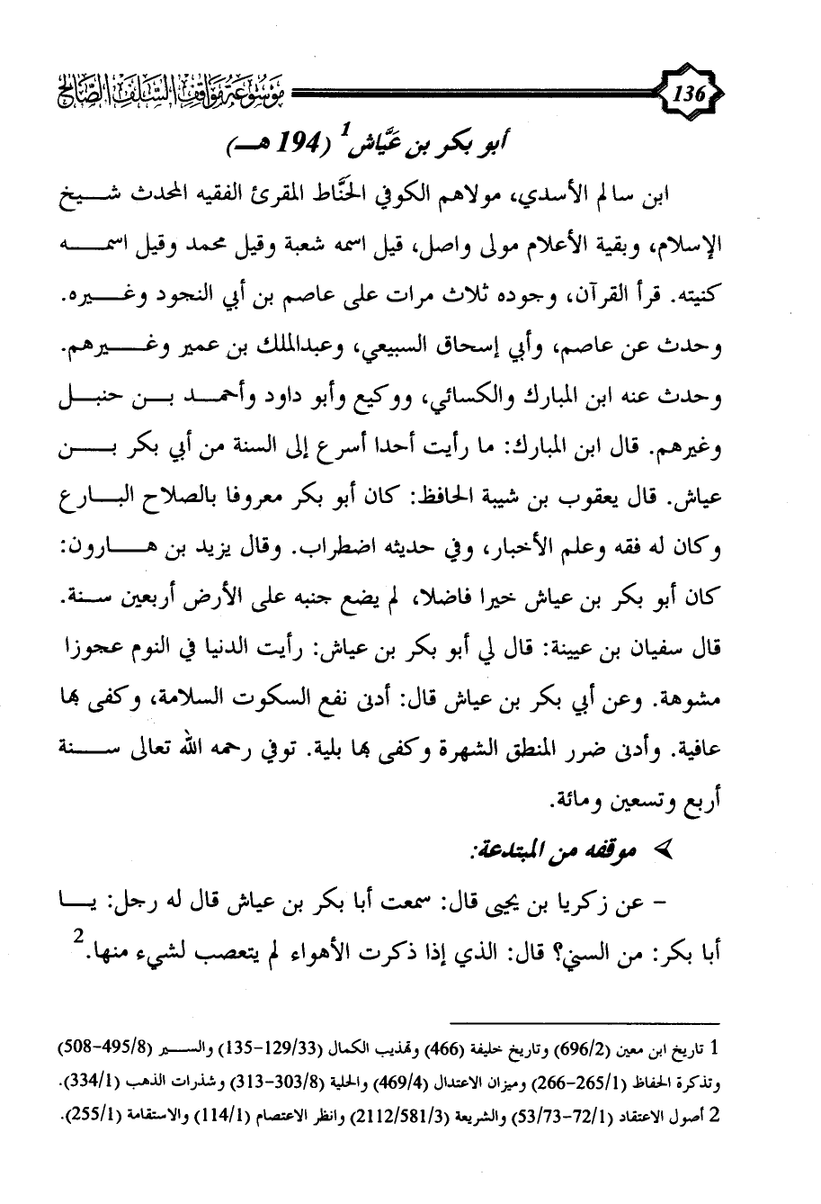 ابن سالم الأسدي، مولاهم الكوفي الحَنَّاط المقرئ الفقيه المحدث شيخ الإسلام، وبقية الأعلام مولى واصل، قيل اسمه شعبة وقيل محمد وقيل اسمه كنيته. قرأ القرآن، وجوده ثلاث مرات على عاصم بن أبي النجود وغيره. وحدث عن عاصم، وأبي إسحاق السبيعي، وعبد الملك بن عمير وغيرهم. وحدث عنه ابن المبارك والكسائي، ووكيع وأبو داود وأحمد بن حنبل وغيرهم. قال ابن المبارك: ما رأيت أحدا أسرع إلى السنة من أبي بكر بن عياش. قال يعقوب بن شيبة الحافظ: كان أبو بكر معروفا بالصلاح البارع وكان له فقه وعلم الأخبار، وفي حديثه اضطراب. وقال يزيد بن هارون: كان أبو بكر بن عياش خيرا فاضلا، لم يضع جنبه على الأرض أربعين سنة. قال سفيان بن عيينة: قال لي أبو بكر بن عياش: رأيت الدنيا في النوم عجوزا مشوهة. وعن أبي بكر بن عياش قال: أدنى نفع السكوت السلامة، وكفى بها عافية. وأدنى ضرر المنطق الشهرة وكفى بها بلية. توفي رحمه الله تعالى سنة أربع وتسعين ومائة.