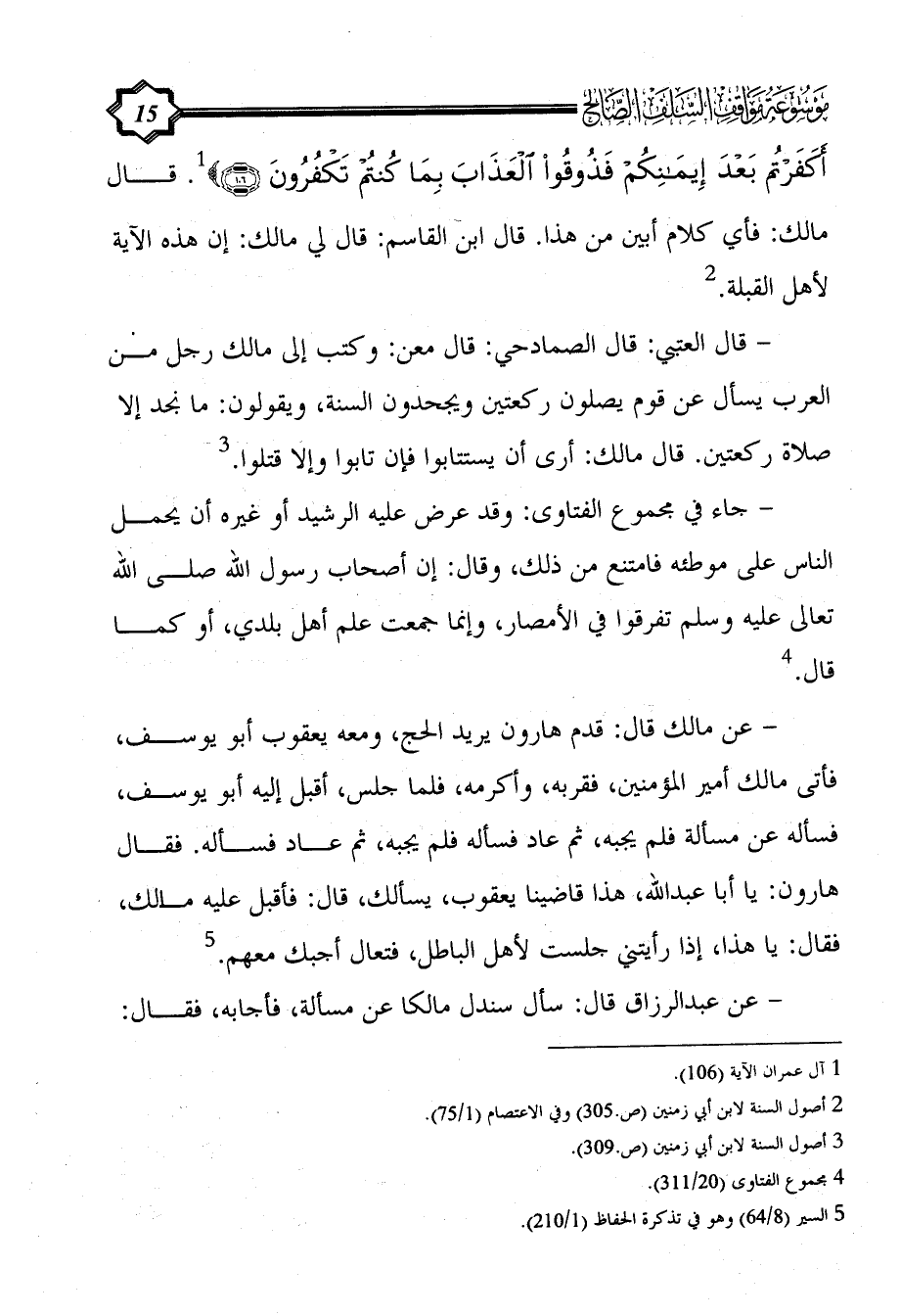- قال العتبي: قال الصمادحي: قال معن: وكتب إلى مالك رجل من العرب يسأل عن قوم يصلون ركعتين ويجحدون السنة، ويقولون: ما نجد إلا صلاة ركعتين. قال مالك: أرى أن يستتابوا فإن تابوا وإلا قتلوا. (¬3)