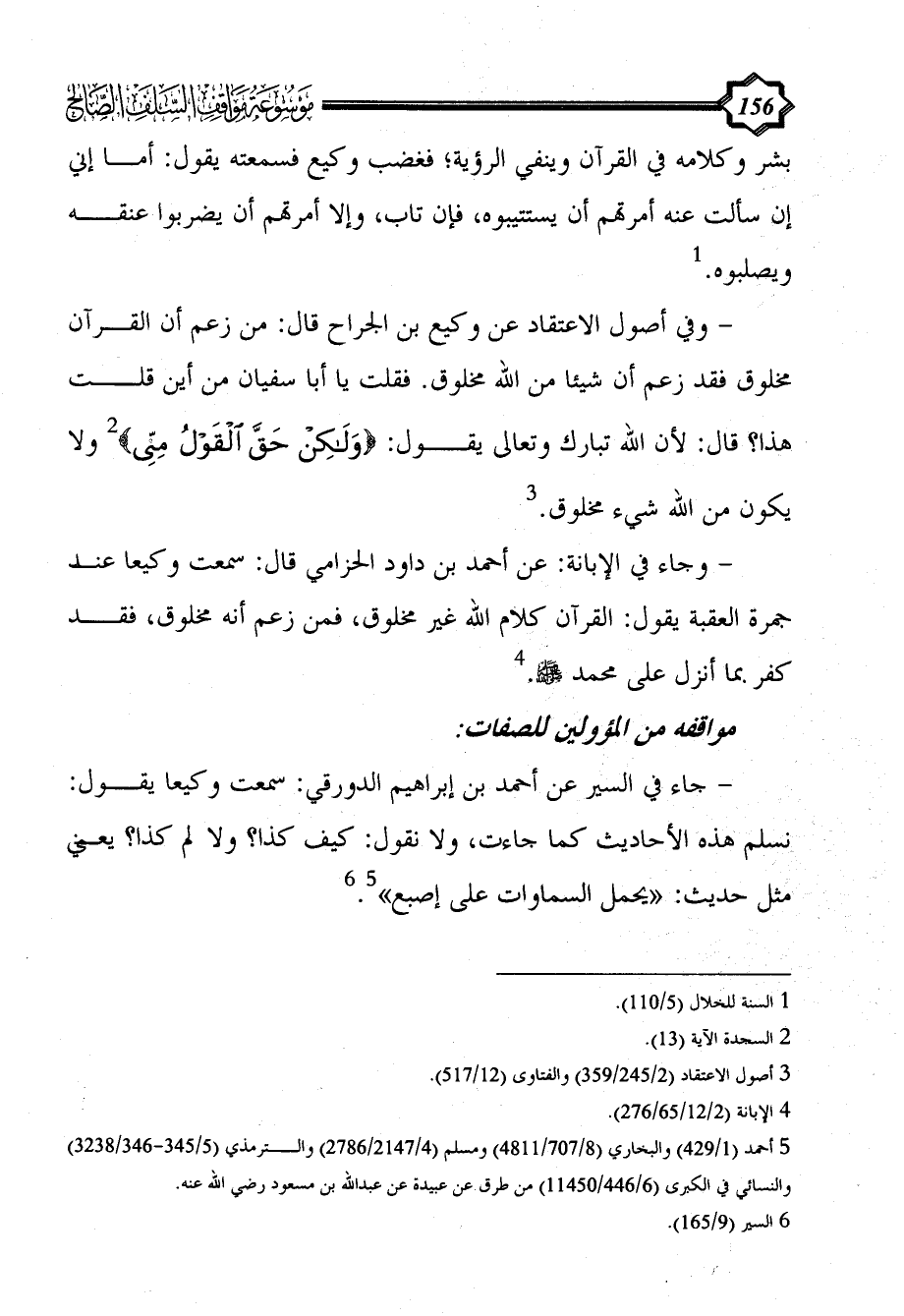- جاء في السير عن أحمد بن إبراهيم الدورقي: سمعت وكيعا يقول: نسلم هذه الأحاديث كما جاءت، ولا نقول: كيف كذا؟ ولا لم كذا؟ يعني مثل حديث: "يحمل السماوات على إصبع" (¬5). (¬6)