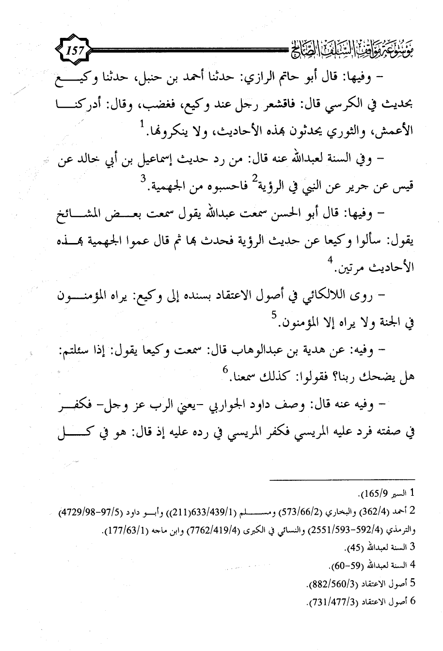 - وفيها: قال أبو الحسن سمعت عبد الله يقول سمعت بعض المشائخ يقول: سألوا وكيعا عن حديث الرؤية فحدث بها ثم قال عموا الجهمية بهذه الأحاديث مرتين. (¬4)