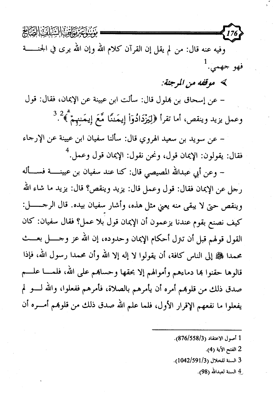 - عن سويد بن سعيد الهروي قال: سألنا سفيان ابن عيينة عن الإرجاء فقال: يقولون: الإيمان قول، ونحن نقول: الإيمان قول وعمل. (¬4)