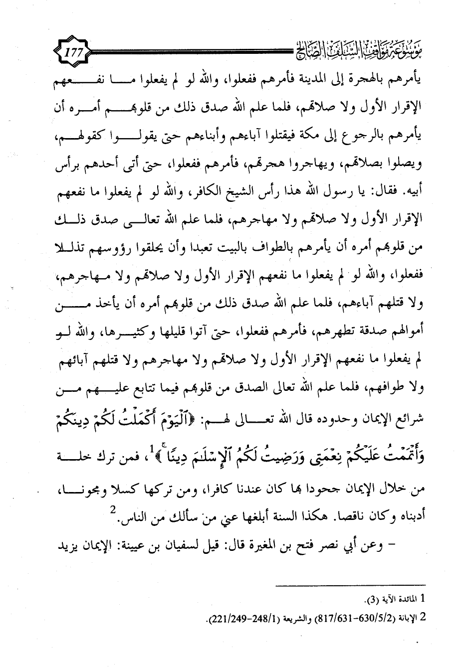 فقال: يا رسول الله هذا رأس الشيخ الكافر، والله لو لم يفعلوا ما نفعهم الإقرار الأول ولا صلاتهم ولا مهاجرهم، فلما علم الله تعالى صدق ذلك من قلوبهم أمره أن يأمرهم بالطواف بالبيت تعبدا وأن يحلقوا رؤوسهم تذللا ففعلوا، والله لو لم يفعلوا ما نفعهم الإقرار الأول ولا صلاتهم ولا مهاجرهم، ولا قتلهم آباءهم، فلما علم الله صدق ذلك من قلوبهم أمره أن يأخذ من أموالهم صدقة تطهرهم، فأمرهم ففعلوا، حتى آتوا قليلها وكثيرها، والله لو لم يفعلوا ما نفعهم الإقرار الأول ولا صلاتهم ولا مهاجرهم ولا قتلهم آبائهم ولا طوافهم، فلما علم الله تعالى الصدق من قلوبهم فيما تتابع عليهم من شرائع الإيمان وحدوده قال الله تعالى لهم: {الْيَوْمَ أَكْمَلْتُ لَكُمْ دِينَكُمْ وَأَتْمَمْتُ عَلَيْكُمْ نِعْمَتِي وَرَضِيتُ لَكُمُ الْإِسْلَامَ دِينًا} (¬1)، فمن ترك خلة من خلال الإيمان جحودا بها كان عندنا كافرا، ومن تركها كسلا ومجونا، أدبناه وكان ناقصا. هكذا السنة أبلغها عني من سألك من الناس. (¬2)