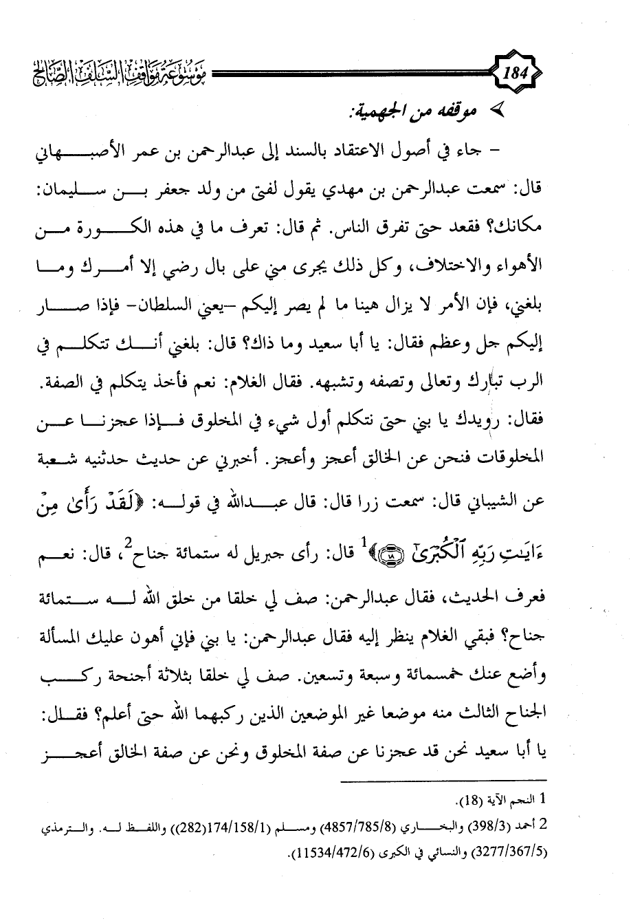 - جاء في أصول الاعتقاد بالسند إلى عبد الرحمن بن عمر الأصبهاني قال: سمعت عبد الرحمن بن مهدي يقول لفتى من ولد جعفر بن سليمان: مكانك؟ فقعد حتى تفرق الناس. ثم قال: تعرف ما في هذه الكورة من الأهواء والاختلاف، وكل ذلك يجرى مني على بال رضي إلا أمرك وما بلغني، فإن الأمر لا يزال هينا ما لم يصر إليكم -يعني السلطان- فإذا صار إليكم جل وعظم فقال: يا أبا سعيد وما ذاك؟ قال: بلغني أنك تتكلم في الرب تبارك وتعالى وتصفه وتشبهه. فقال الغلام: نعم فأخذ يتكلم في الصفة. فقال: رويدك يا بني حتى نتكلم أول شيء في المخلوق فإذا عجزنا عن المخلوقات فنحن عن الخالق أعجز وأعجز. أخبرني عن حديث حدثنيه شعبة عن الشيباني قال: سمعت زرا قال: قال عبد الله في قوله: {لَقَدْ رَأَى مِنْ آيَاتِ رَبِّهِ الْكُبْرَى} (¬1) قال: رأى جبريل له ستمائة جناح (¬2)، قال: نعم فعرف الحديث، فقال عبد الرحمن: صف لي خلقا من خلق الله له ستمائة جناح؟ فبقي الغلام ينظر إليه فقال عبد الرحمن: يا بني فإني أهون عليك المسألة وأضع عنك خمسمائة وسبعة وتسعين. صف لي خلقا بثلاثة أجنحة ركب الجناح الثالث منه موضعا غير الموضعين الذين ركبهما الله حتى أعلم؟ فقال: يا أبا سعيد نحن قد عجزنا عن صفة المخلوق ونحن عن صفة الخالق أعجز