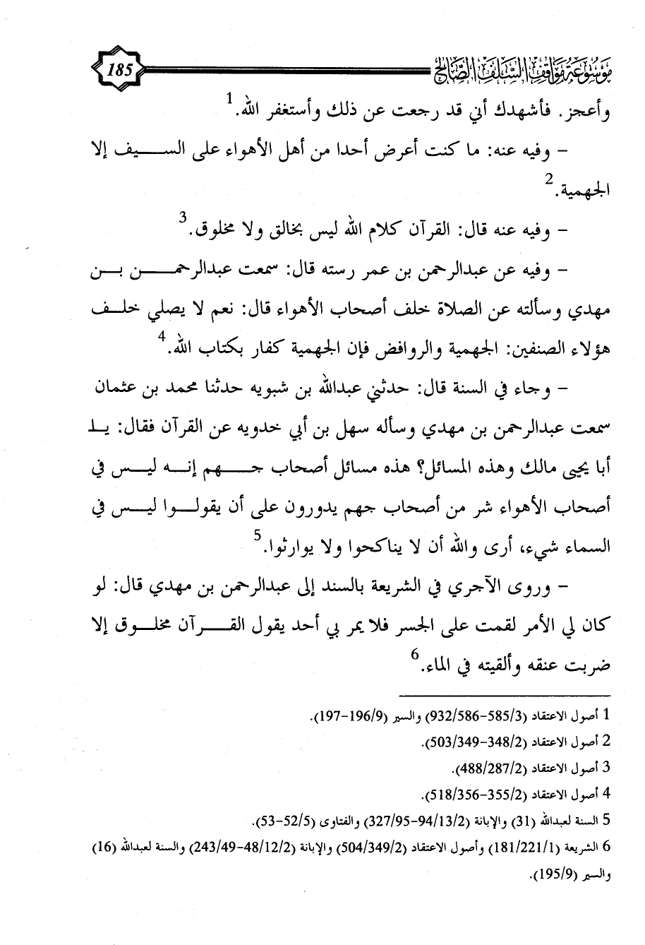 (¬6) الشريعة (1/ 221/181) وأصول الاعتقاد (2/ 349/504) والإبانة (2/ 12/48 - 49/ 243) والسنة لعبد الله (16) والسير (9/ 195).