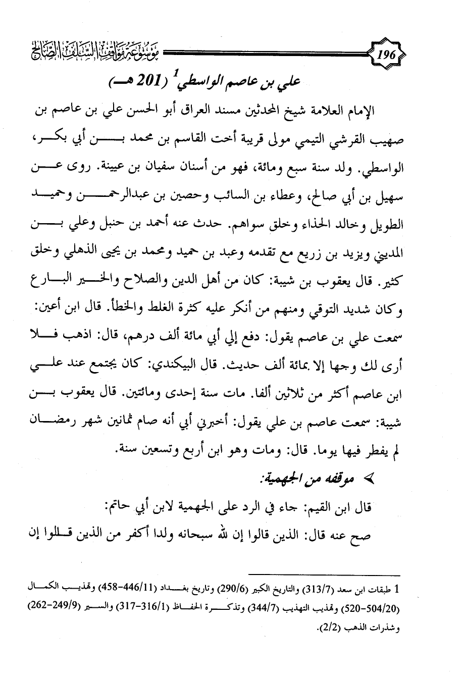 الإمام العلامة شيخ المحدثين مسند العراق أبو الحسن علي بن عاصم بن صهيب القرشي التيمي مولى قريبة أخت القاسم بن محمد بن أبي بكر، الواسطي. ولد سنة سبع ومائة، فهو من أسنان سفيان بن عيينة. روى عن سهيل بن أبي صالح، وعطاء بن السائب وحصين بن عبد الرحمن وحميد الطويل وخالد الحذاء وخلق سواهم. حدث عنه أحمد بن حنبل وعلي بن المديني ويزيد بن زريع مع تقدمه وعبد بن حميد ومحمد بن يحيى الذهلي وخلق كثير. قال يعقوب بن شيبة: كان من أهل الدين والصلاح والخير البارع وكان شديد التوقي ومنهم من أنكر عليه كثرة الغلط والخطأ. قال ابن أعين: سمعت علي بن عاصم يقول: دفع إلي أبي مائة ألف درهم، قال: اذهب فلا أرى لك وجها إلا بمائة ألف حديث. قال البيكندي: كان يجتمع عند علي ابن عاصم أكثر من ثلاثين ألفا. مات سنة إحدى ومائتين. قال يعقوب بن شيبة: سمعت عاصم بن علي يقول: أخبرني أبي أنه صام ثمانين شهر رمضان لم يفطر فيها يوما. قال: ومات وهو ابن أربع وتسعين سنة.