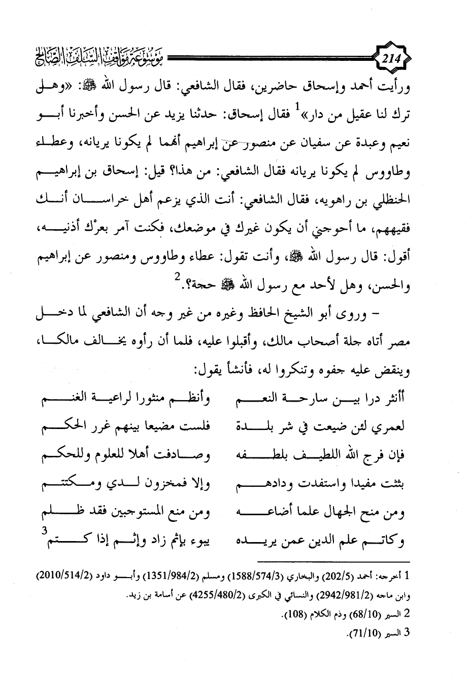 - وروى أبو الشيخ الحافظ وغيره من غير وجه أن الشافعي لما دخل مصر أتاه جلة أصحاب مالك، وأقبلوا عليه، فلما أن رأوه يخالف مالكا، وينقض عليه جفوه وتنكروا له، فأنشأ يقول: