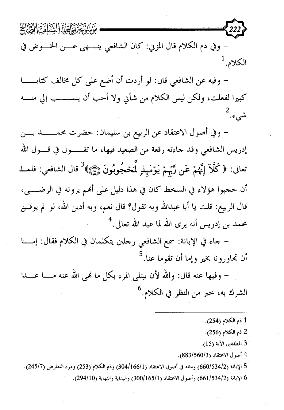 - وفي ذم الكلام قال المزني: كان الشافعي ينهى عن الخوض في الكلام. (¬1)