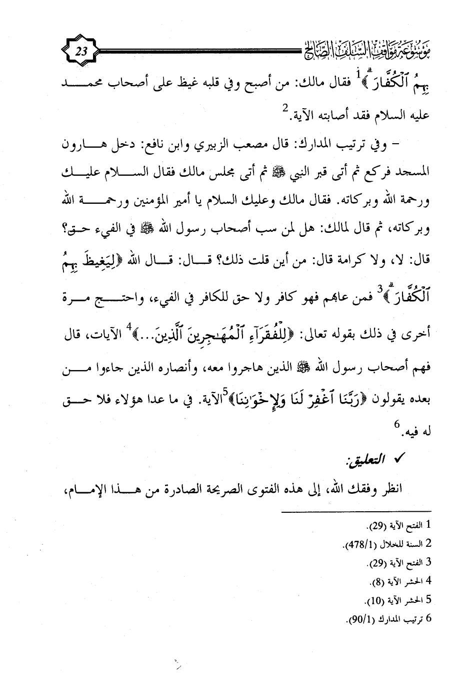 - وفي ترتيب المدارك: قال مصعب الزبيري وابن نافع: دخل هارون المسجد فركع ثم أتى قبر النبي - صلى الله عليه وسلم - ثم أتى مجلس مالك فقال السلام عليك ورحمة الله وبركاته. فقال مالك وعليك السلام يا أمير المؤمنين ورحمة الله وبركاته، ثم قال لمالك: هل لمن سب أصحاب رسول الله - صلى الله عليه وسلم - في الفيء حق؟ قال: لا، ولا كرامة قال: من أين قلت ذلك؟ قال: قال الله {ليغيظ بِهِمُ الكفار} (¬3) فمن عابهم فهو كافر ولا حق للكافر في الفيء، واحتج مرة أخرى في ذلك بقوله تعالى: {لِلْفُقَرَاءِ الْمُهَاجِرِينَ الذين ... } (¬4) الآيات، قال فهم أصحاب رسول الله - صلى الله عليه وسلم - الذين هاجروا معه، وأنصاره الذين جاءوا من بعده يقولون {ربنا اغْفِرْ لَنَا وَلِإِخْوَانِنَا} (¬5) الآية. في ما عدا هؤلاء فلا حق له فيه. (¬6)