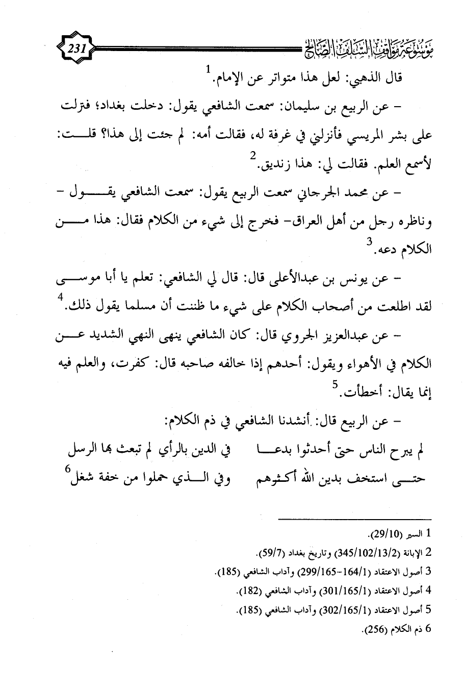 (¬4) أصول الاعتقاد (1/ 165/301) وآداب الشافعي (182).