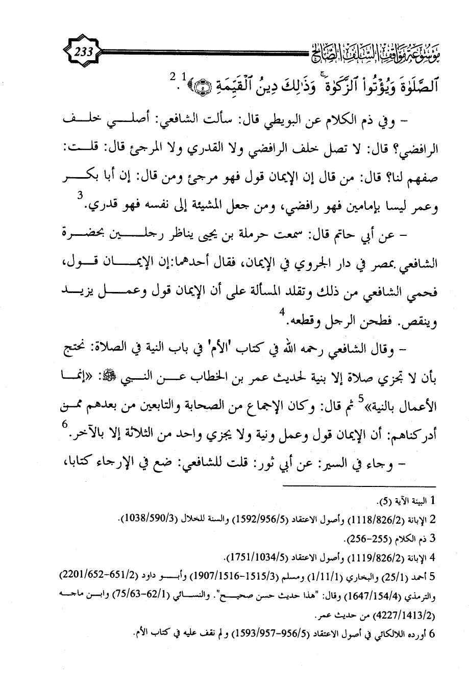 - وقال الشافعي رحمه الله في كتاب 'الأم' في باب النية في الصلاة: نحتج بأن لا تجزي صلاة إلا بنية لحديث عمر بن الخطاب عن النبي - صلى الله عليه وسلم -: "إنما الأعمال بالنية" (¬5) ثم قال: وكان الإجماع من الصحابة والتابعين من بعدهم ممن أدركناهم: أن الإيمان قول وعمل ونية ولا يجزي واحد من الثلاثة إلا بالآخر. (¬6)