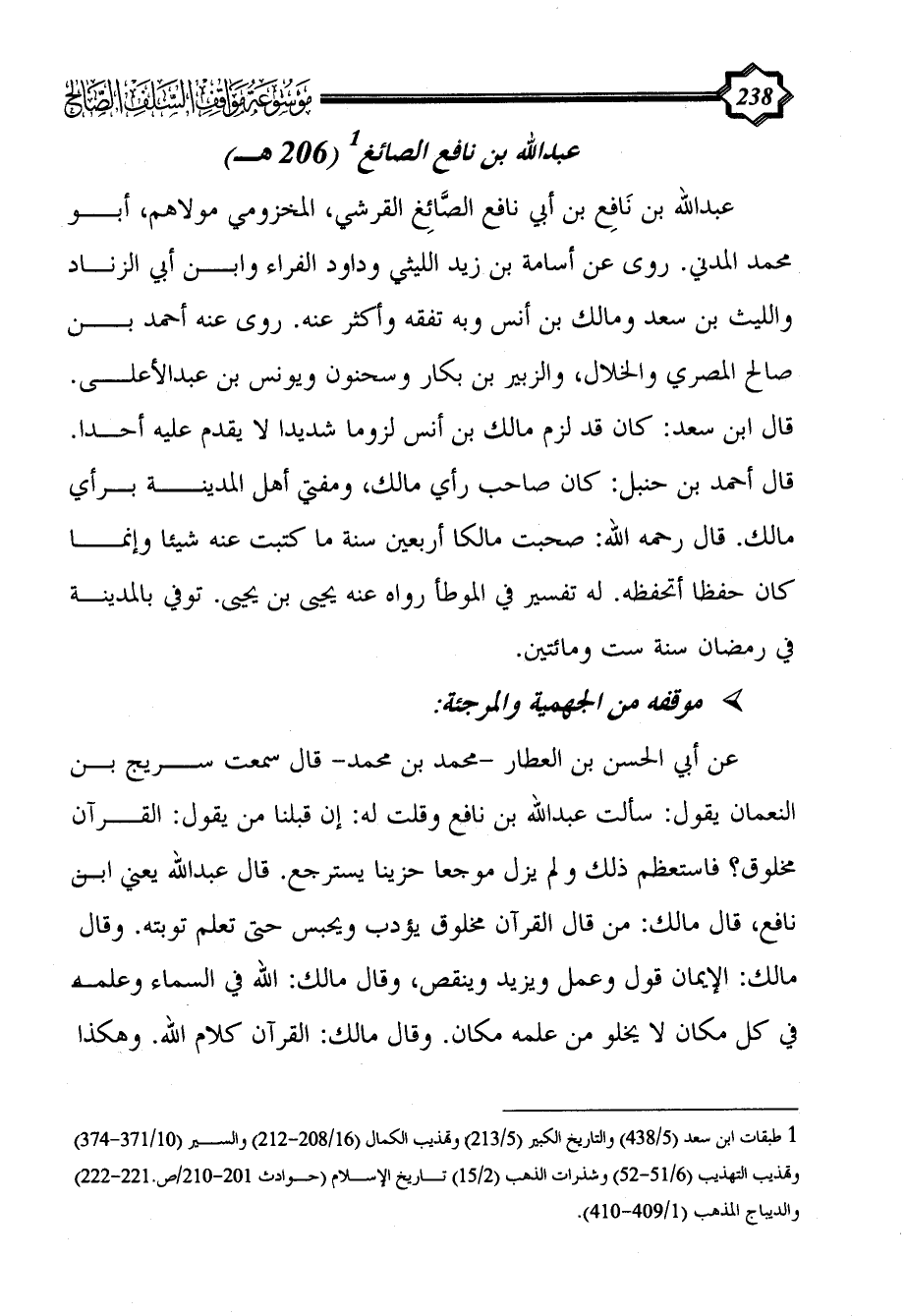 عن أبي الحسن بن العطار -محمد بن محمد- قال سمعت سريج بن النعمان يقول: سألت عبد الله بن نافع وقلت له: إن قبلنا من يقول: القرآن مخلوق؟ فاستعظم ذلك ولم يزل موجعا حزينا يسترجع. قال عبد الله يعني ابن نافع، قال مالك: من قال القرآن مخلوق يؤدب ويحبس حتى تعلم توبته. وقال مالك: الإيمان قول وعمل ويزيد وينقص، وقال مالك: الله في السماء وعلمه في كل مكان لا يخلو من علمه مكان. وقال مالك: القرآن كلام الله. وهكذا
