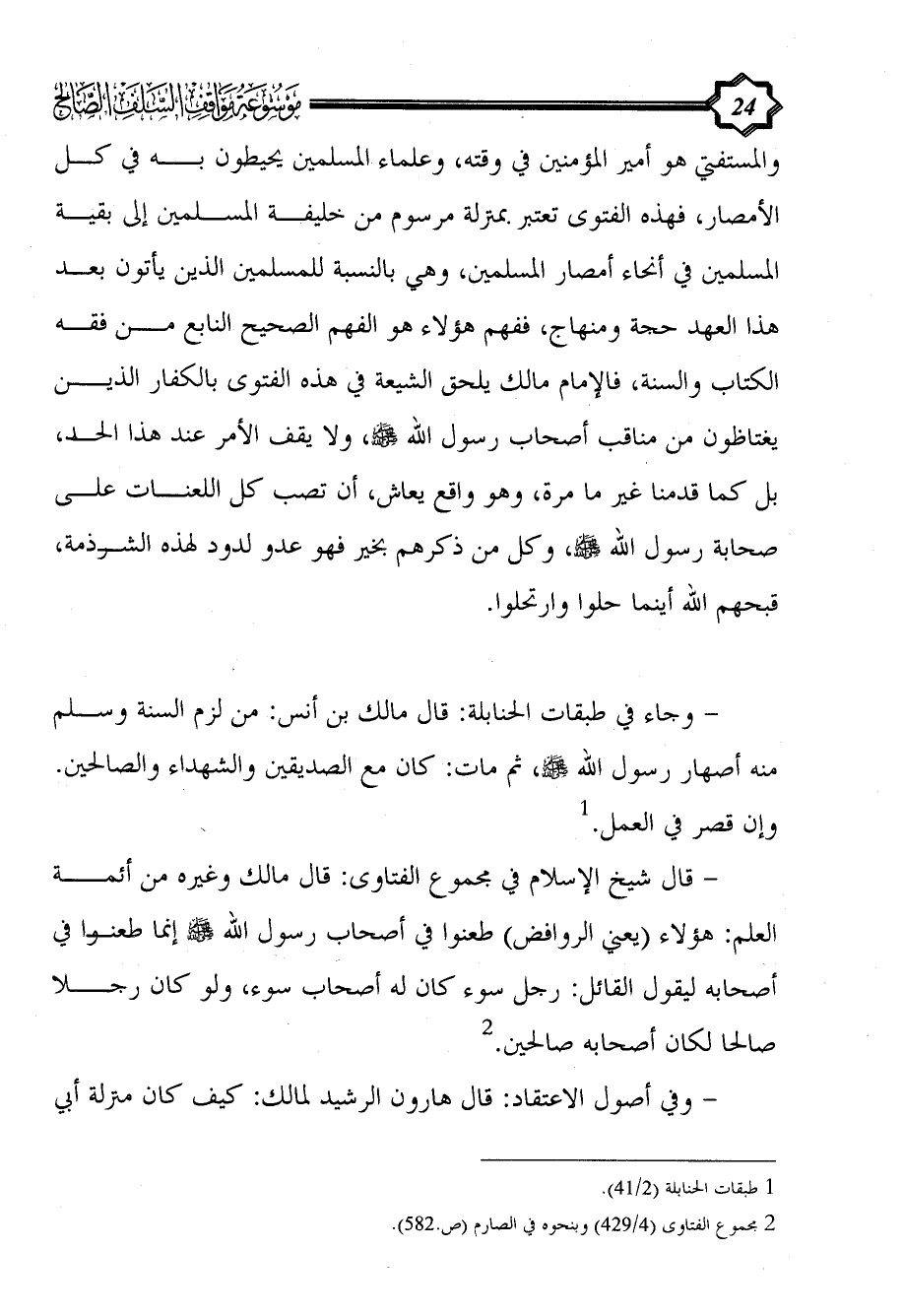 والمستفتي هو أمير المؤمنين في وقته، وعلماء المسلمين يحيطون به في كل الأمصار، فهذه الفتوى تعتبر بمنزلة مرسوم من خليفة المسلمين إلى بقية المسلمين في أنحاء أمصار المسلمين، وهي بالنسبة للمسلمين الذين يأتون بعد هذا العهد حجة ومنهاج، ففهم هؤلاء هو الفهم الصحيح النابع من فقه الكتاب والسنة، فالإمام مالك يلحق الشيعة في هذه الفتوى بالكفار الذين يغتاظون من مناقب أصحاب رسول الله - صلى الله عليه وسلم -، ولا يقف الأمر عند هذا الحد، بل كما قدمنا غير ما مرة، وهو واقع يعاش، أن تصب كل اللعنات على صحابة رسول الله - صلى الله عليه وسلم -، وكل من ذكرهم بخير فهو عدو لدود لهذه الشرذمة، قبحهم الله أينما حلوا وارتحلوا.