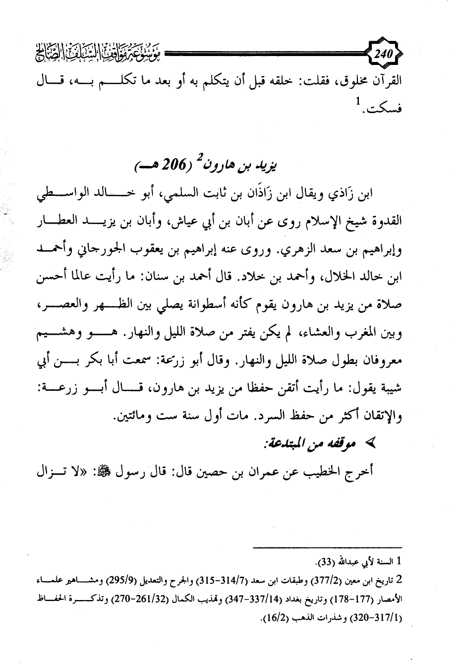 (¬2) تاريخ ابن معين (2/ 377) وطبقات ابن سعد (7/ 314 - 315) والجرح والتعديل (9/ 295) ومشاهير علماء الأمصار (177 - 178) وتاريخ بغداد (14/ 337 - 347) وتهذيب الكمال (32/ 261 - 270) وتذكرة الحفاظ (1/ 317 - 320) وشذرات الذهب (2/ 16).