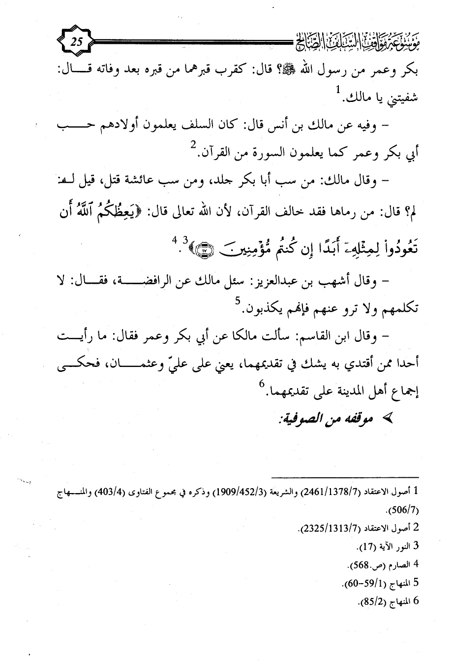 - وفيه عن مالك بن أنس قال: كان السلف يعلمون أولادهم حب أبي بكر وعمر كما يعلمون السورة من القرآن. (¬2)
