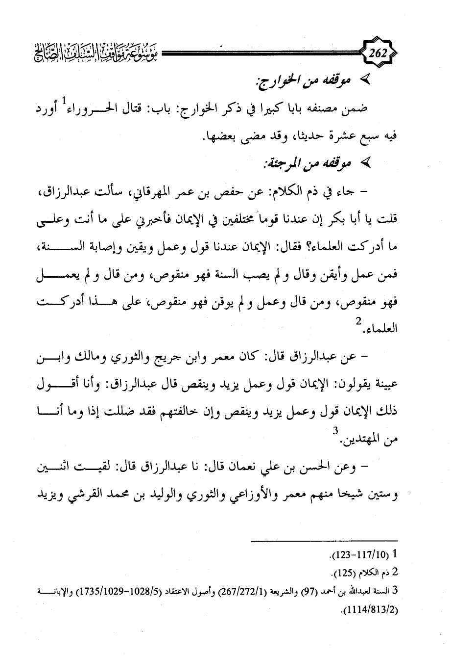 - جاء في ذم الكلام: عن حفص بن عمر المهرقاني، سألت عبد الرزاق، قلت يا أبا بكر إن عندنا قوما مختلفين في الإيمان فأخبرني على ما أنت وعلى ما أدركت العلماء؟ فقال: الإيمان عندنا قول وعمل ويقين وإصابة السنة، فمن عمل وأيقن وقال ولم يصب السنة فهو منقوص، ومن قال ولم يعمل فهو منقوص، ومن قال وعمل ولم يوقن فهو منقوص، على هذا أدركت العلماء. (¬2)