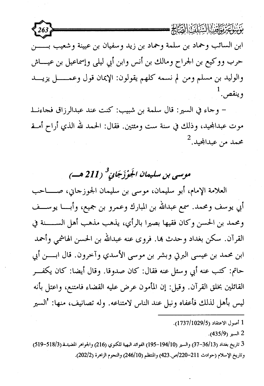 العلامة الإمام، أبو سليمان، موسى بن سليمان الجوزجاني، صاحب أبي يوسف ومحمد. سمع عبد الله بن المبارك وعمرو بن جميع، وأبا يوسف ومحمد بن الحسن وكان فقيها بصيرا بالرأي، يذهب مذهب أهل السنة في القرآن. سكن بغداد وحدث بها. فروى عنه عبد الله بن الحسن الهاشمي وأحمد ابن محمد بن عيسى البرتي وبشر بن موسى الأسدي وآخرون. قال ابن أبي حاتم: كتب عنه أبي وسئل عنه فقال: كان صدوقا. وقال أيضا: كان يكفر القائلين بخلق القرآن. وقيل: إن المأمون عرض عليه القضاء فامتنع، واعتل بأنه ليس بأهل لذلك فأعفاه ونبل عند الناس لامتناعه. وله تصانيف، منها: 'السير