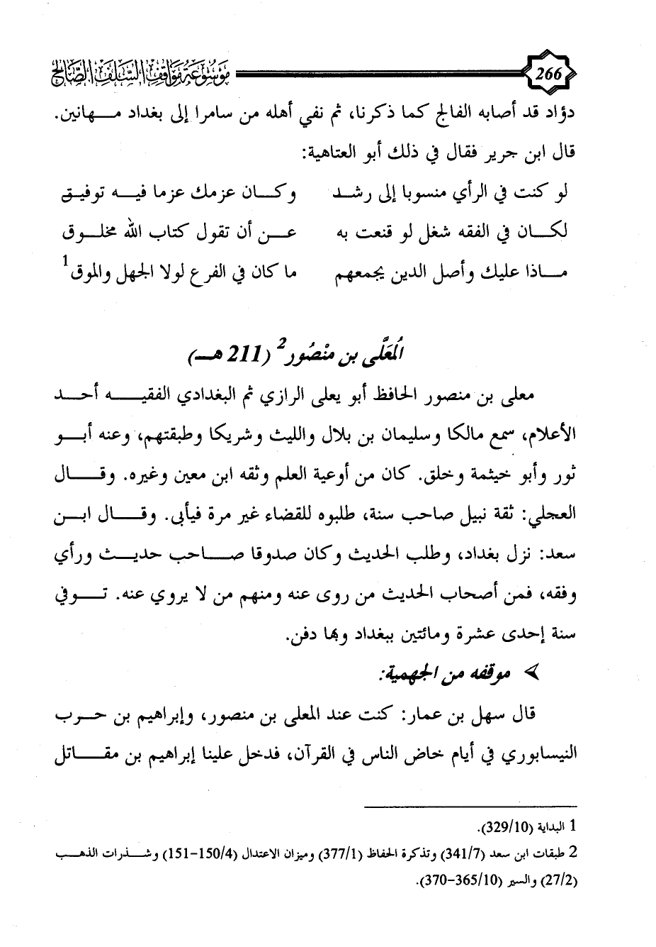 معلى بن منصور الحافظ أبو يعلى الرازي ثم البغدادي الفقيه أحد الأعلام، سمع مالكا وسليمان بن بلال والليث وشريكا وطبقتهم، وعنه أبو ثور وأبو خيثمة وخلق. كان من أوعية العلم وثقه ابن معين وغيره. وقال العجلي: ثقة نبيل صاحب سنة، طلبوه للقضاء غير مرة فيأبى. وقال ابن سعد: نزل بغداد، وطلب الحديث وكان صدوقا صاحب حديث ورأي وفقه، فمن أصحاب الحديث من روى عنه ومنهم من لا يروي عنه. توفي سنة إحدى عشرة ومائتين ببغداد وبها دفن.