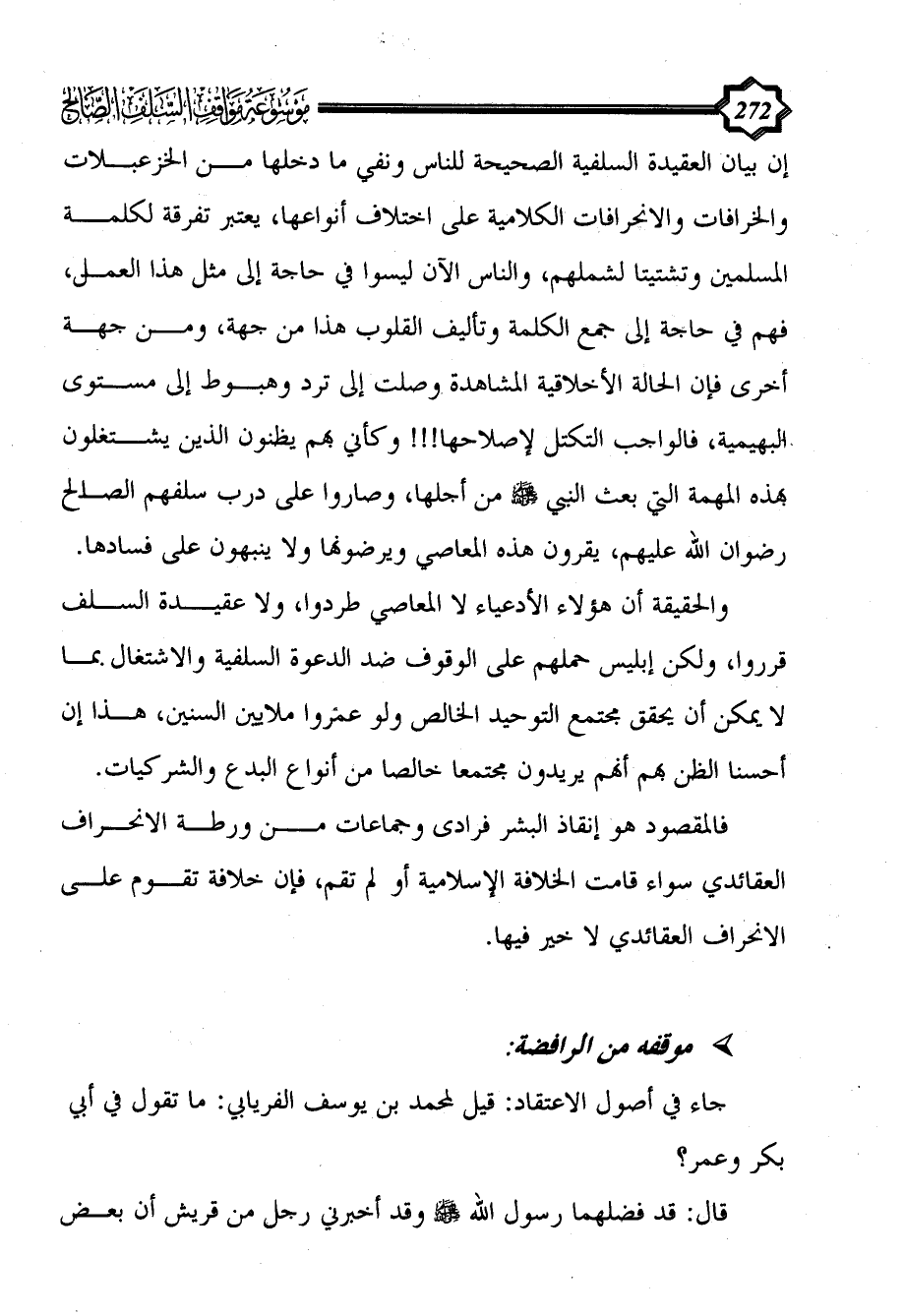 إن بيان العقيدة السلفية الصحيحة للناس ونفي ما دخلها من الخزعبلات والخرافات والانحرافات الكلامية على اختلاف أنواعها، يعتبر تفرقة لكلمة المسلمين وتشتيتا لشملهم، والناس الآن ليسوا في حاجة إلى مثل هذا العمل، فهم في حاجة إلى جمع الكلمة وتأليف القلوب هذا من جهة، ومن جهة أخرى فإن الحالة الأخلاقية المشاهدة وصلت إلى ترد وهبوط إلى مستوى البهيمية، فالواجب التكتل لإصلاحها!!! وكأني بهم يظنون الذين يشتغلون بهذه المهمة التي بعث النبي - صلى الله عليه وسلم - من أجلها، وصاروا على درب سلفهم الصالح رضوان الله عليهم، يقرون هذه المعاصي ويرضونها ولا ينبهون على فسادها.
