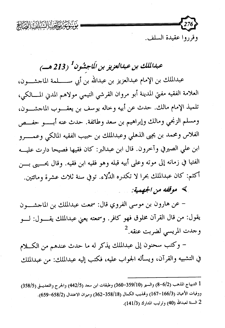 - عن هارون بن موسى الفروي قال: سمعت عبد الملك بن الماجشون يقول: من قال القرآن مخلوق فهو كافر. وسمعته يعني عبد الملك يقول: لو وجدت المريسي لضربت عنقه. (¬2)
