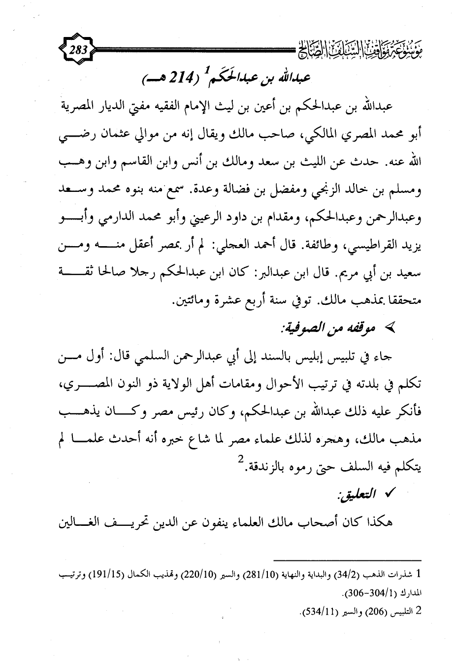 جاء في تلبيس إبليس بالسند إلى أبي عبد الرحمن السلمي قال: أول من تكلم في بلدته في ترتيب الأحوال ومقامات أهل الولاية ذو النون المصري، فأنكر عليه ذلك عبد الله بن عبد الحكم، وكان رئيس مصر وكان يذهب مذهب مالك، وهجره لذلك علماء مصر لما شاع خبره أنه أحدث علما لم يتكلم فيه السلف حتى رموه بالزندقة. (¬2)