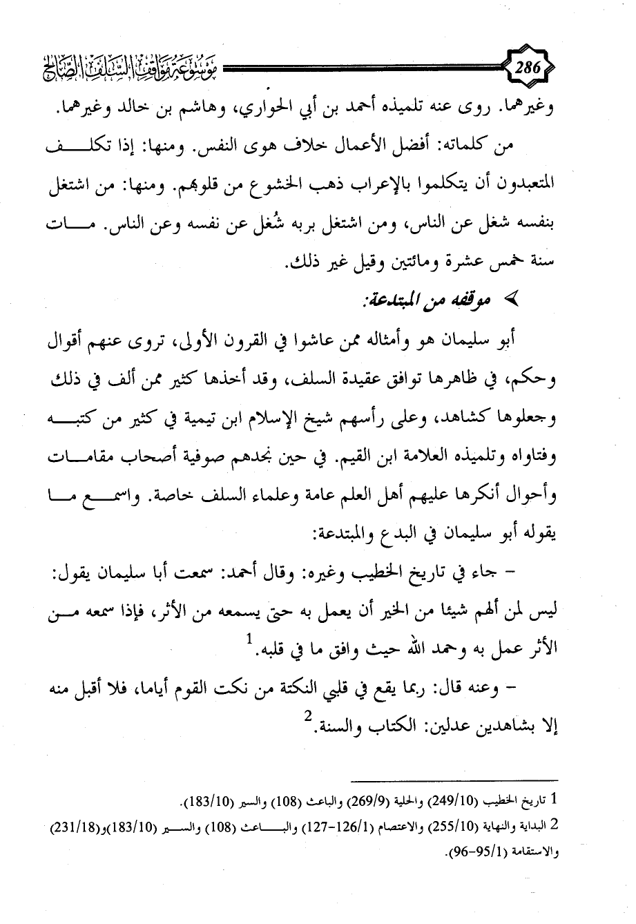 أبو سليمان هو وأمثاله ممن عاشوا في القرون الأولى، تروى عنهم أقوال وحكم، في ظاهرها توافق عقيدة السلف، وقد أخذها كثير ممن ألف في ذلك وجعلوها كشاهد، وعلى رأسهم شيخ الإسلام ابن تيمية في كثير من كتبه وفتاواه وتلميذه العلامة ابن القيم. في حين نجدهم صوفية أصحاب مقامات وأحوال أنكرها عليهم أهل العلم عامة وعلماء السلف خاصة. واسمع ما يقوله أبو سليمان في البدع والمبتدعة: