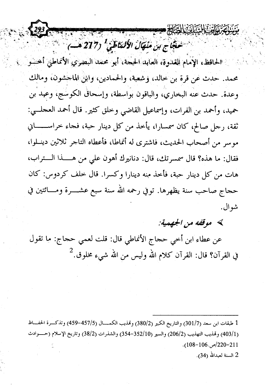 عن عطاء ابن أخي حجاج الأنماطي قال: قلت لعمي حجاج: ما تقول في القرآن؟ قال: القرآن كلام الله وليس من الله شيء مخلوق. (¬2)