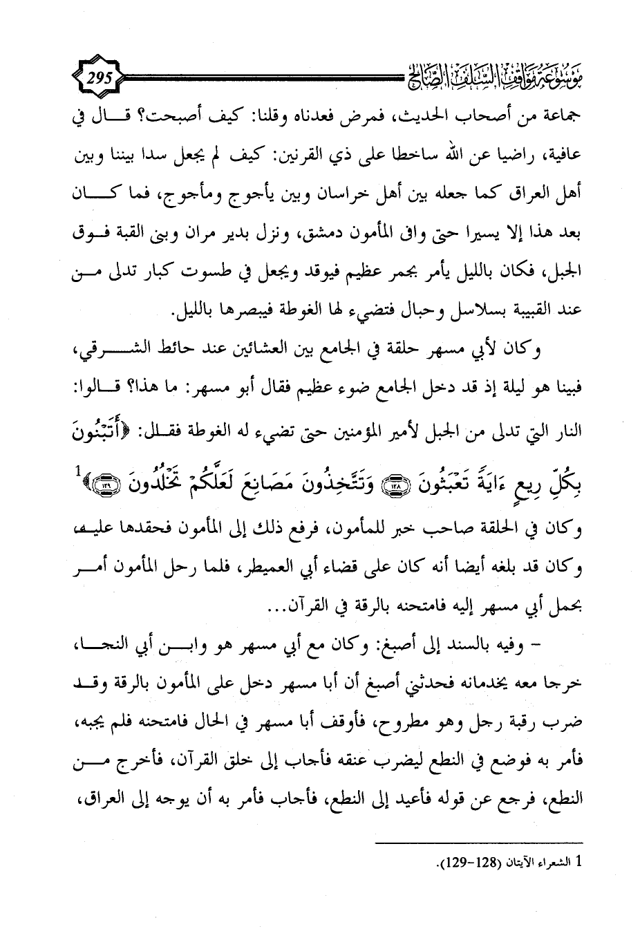 جماعة من أصحاب الحديث، فمرض فعدناه وقلنا: كيف أصبحت؟ قال في عافية، راضيا عن الله ساخطا على ذي القرنين: كيف لم يجعل سدا بيننا وبين أهل العراق كما جعله بين أهل خراسان وبين يأجوج ومأجوج، فما كان بعد هذا إلا يسيرا حتى وافى المأمون دمشق، ونزل بدير مران وبنى القبة فوق الجبل، فكان بالليل يأمر بجمر عظيم فيوقد ويجعل في طسوت كبار تدلى من عند القبيبة بسلاسل وحبال فتضيء لها الغوطة فيبصرها بالليل.