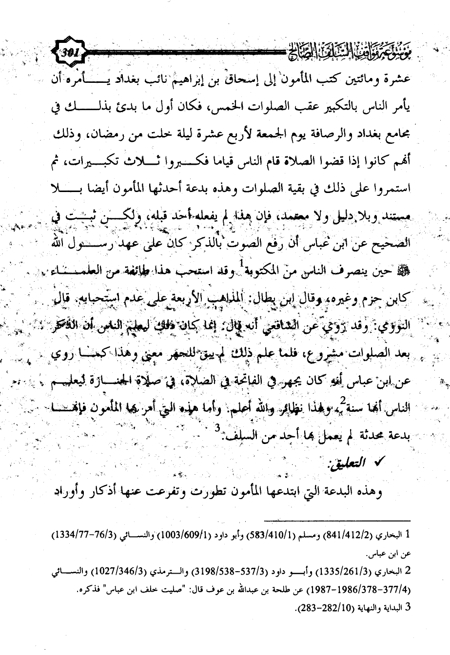عشرة ومائتين كتب المأمون إلى إسحاق بن إبراهيم نائب بغداد يأمره أن يأمر الناس بالتكبير عقب الصلوات الخمس، فكان أول ما بدئ بذلك في مجامع بغداد والرصافة يوم الجمعة لأربع عشرة ليلة خلت من رمضان، وذلك أنهم كانوا إذا قضوا الصلاة قام الناس قياما فكبروا ثلاث تكبيرات، ثم استمروا على ذلك في بقية الصلوات وهذه بدعة أحدثها المأمون أيضا بلا مستند وبلا دليل ولا معتمد، فإن هذا لم يفعله أحد قبله، ولكن ثبت في الصحيح عن ابن عباس أن رفع الصوت بالذكر كان على عهد رسول الله - صلى الله عليه وسلم - حين ينصرف الناس من المكتوبة (¬1) وقد استحب هذا طائفة من العلماء كابن حزم وغيره، وقال ابن بطال: المذاهب الأربعة على عدم استحبابه. قال النووي: وقد روي عن الشافعي أنه قال: إنما كان ذلك ليعلم الناس أن الذكر بعد الصلوات مشروع، فلما علم ذلك لم يبق للجهر معنى وهذا كما روي عن ابن عباس أنه كان يجهر في الفاتحة في الصلاة، في صلاة الجنازة ليعلم الناس أنها سنة (¬2)، ولهذا نظائر والله أعلم. وأما هذه التي أمر بها المأمون فإنها بدعة محدثة لم يعمل بها أحد من السلف. (¬3)