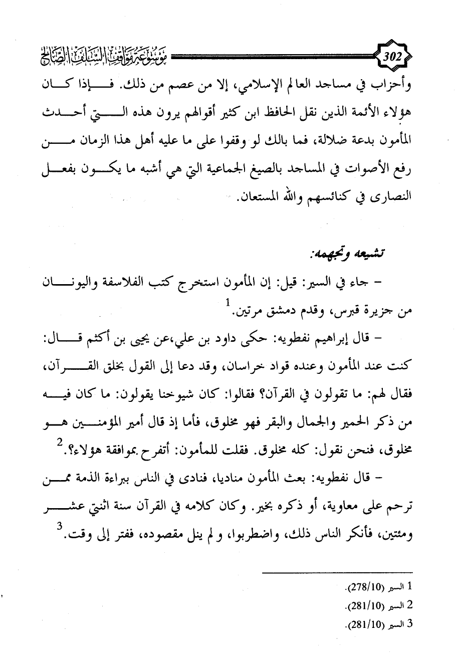 وأحزاب في مساجد العالم الإسلامي، إلا من عصم من ذلك. فإذا كان هؤلاء الأئمة الذين نقل الحافظ ابن كثير أقوالهم يرون هذه التي أحدث المأمون بدعة ضلالة، فما بالك لو وقفوا على ما عليه أهل هذا الزمان من رفع الأصوات في المساجد بالصيغ الجماعية التي هي أشبه ما يكون بفعل النصارى في كنائسهم والله المستعان.