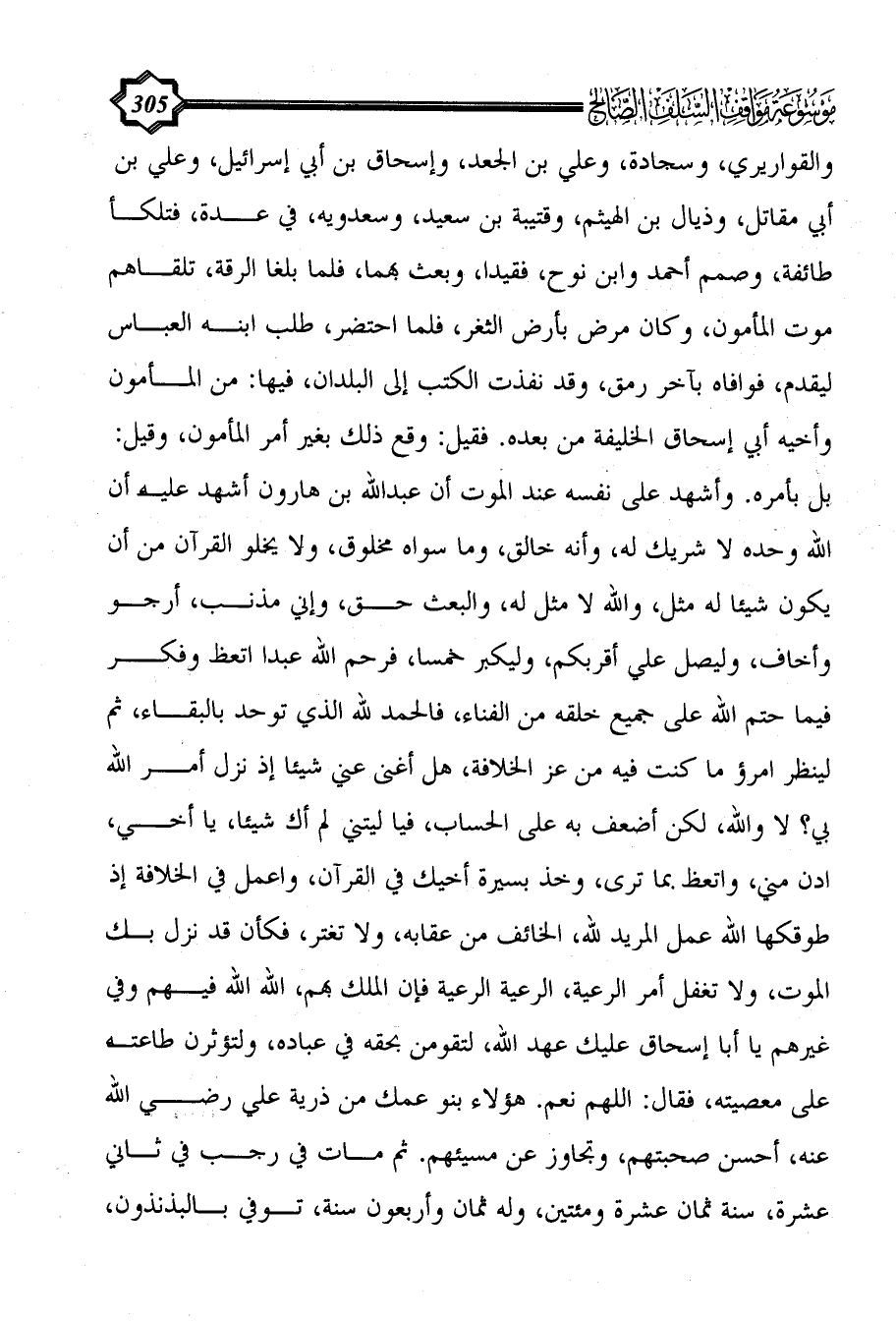 والقواريري، وسجادة، وعلي بن الجعد، وإسحاق بن أبي إسرائيل، وعلي بن أبي مقاتل، وذيال بن الهيثم، وقتيبة بن سعيد، وسعدويه، في عدة، فتلكأ طائفة، وصمم أحمد وابن نوح، فقيدا، وبعث بهما، فلما بلغا الرقة، تلقاهم موت المأمون، وكان مرض بأرض الثغر، فلما احتضر، طلب ابنه العباس ليقدم، فوافاه بآخر رمق، وقد نفذت الكتب إلى البلدان، فيها: من المأمون وأخيه أبي إسحاق الخليفة من بعده. فقيل: وقع ذلك بغير أمر المأمون، وقيل: بل بأمره. وأشهد على نفسه عند الموت أن عبد الله بن هارون أشهد عليه أن الله وحده لا شريك له، وأنه خالق، وما سواه مخلوق، ولا يخلو القرآن من أن يكون شيئا له مثل، والله لا مثل له، والبعث حق، وإني مذنب، أرجو وأخاف، وليصل علي أقربكم، وليكبر خمسا، فرحم الله عبدا اتعظ وفكر فيما حتم الله على جميع خلقه من الفناء، فالحمد لله الذي توحد بالبقاء، ثم لينظر امرؤ ما كنت فيه من عز الخلافة، هل أغنى عني شيئا إذ نزل أمر الله بي؟ لا والله، لكن أضعف به على الحساب، فيا ليتني لم أك شيئا، يا أخي، ادن مني، واتعظ بما ترى، وخذ بسيرة أخيك في القرآن، واعمل في الخلافة إذ طوقكها الله عمل المريد لله، الخائف من عقابه، ولا تغتر، فكأن قد نزل بك الموت، ولا تغفل أمر الرعية، الرعية الرعية فإن الملك بهم، الله الله فيهم وفي غيرهم يا أبا إسحاق عليك عهد الله، لتقومن بحقه في عباده، ولتؤثرن طاعته على معصيته، فقال: اللهم نعم. هؤلاء بنو عمك من ذرية علي رضي الله عنه، أحسن صحبتهم، وتجاوز عن مسيئهم.