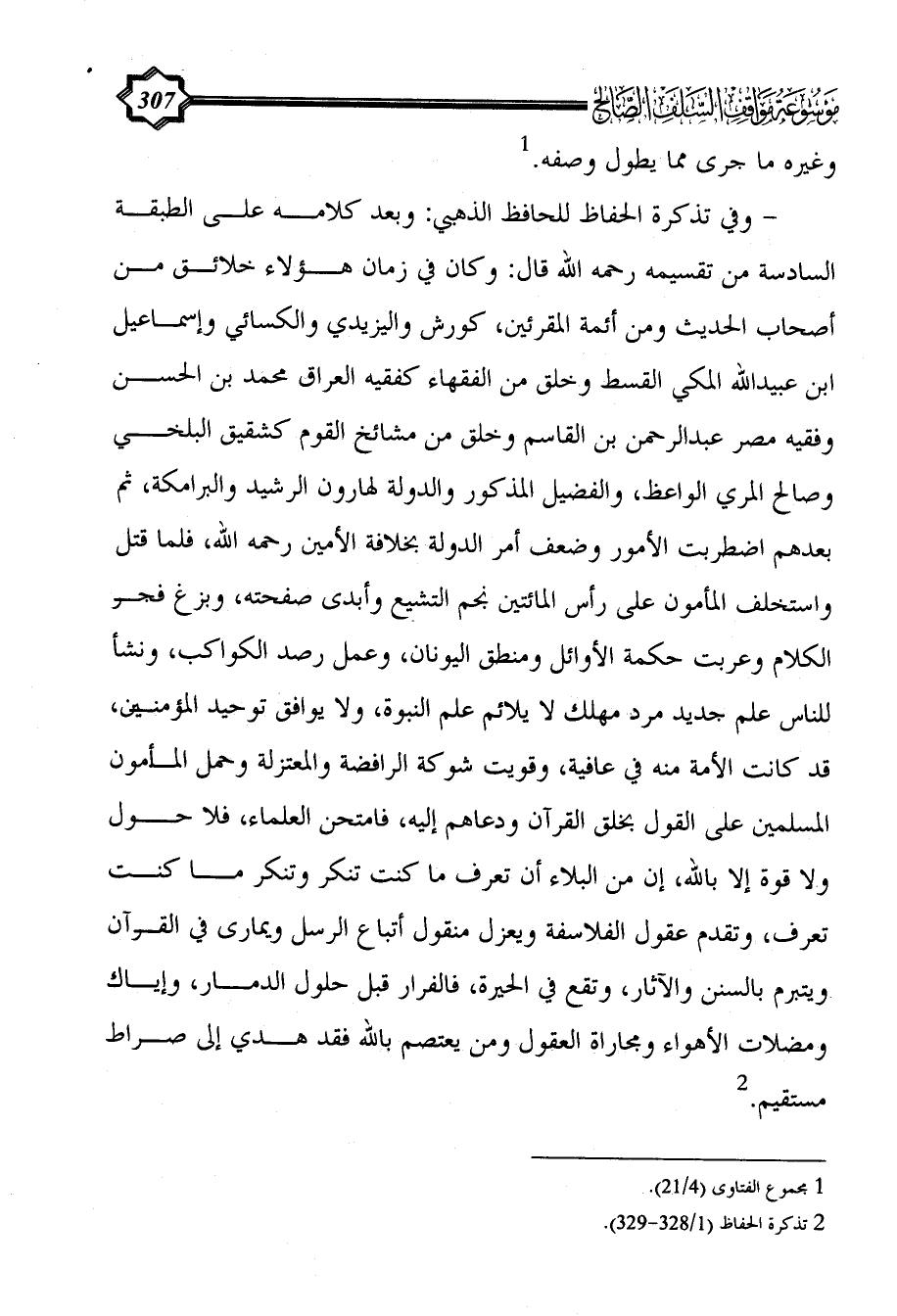 - وفي تذكرة الحفاظ للحافظ الذهبي: وبعد كلامه على الطبقة السادسة من تقسيمه رحمه الله قال: وكان في زمان هؤلاء خلائق من أصحاب الحديث ومن أئمة المقرئين، كورش واليزيدي والكسائي وإسماعيل ابن عبيد الله المكي القسط وخلق من الفقهاء كفقيه العراق محمد بن الحسن وفقيه مصر عبد الرحمن بن القاسم وخلق من مشائخ القوم كشقيق البلخي وصالح المري الواعظ، والفضيل المذكور والدولة لهارون الرشيد والبرامكة، ثم بعدهم اضطربت الأمور وضعف أمر الدولة بخلافة الأمين رحمه الله، فلما قتل واستخلف المأمون على رأس المائتين نجم التشيع وأبدى صفحته، وبزغ فجر الكلام وعربت حكمة الأوائل ومنطق اليونان، وعمل رصد الكواكب، ونشأ للناس علم جديد مرد مهلك لا يلائم علم النبوة، ولا يوافق توحيد المؤمنين، قد كانت الأمة منه في عافية، وقويت شوكة الرافضة والمعتزلة وحمل المأمون المسلمين على القول بخلق القرآن ودعاهم إليه، فامتحن العلماء، فلا حول ولا قوة إلا بالله، إن من البلاء أن تعرف ما كنت تنكر وتنكر ما كنت تعرف، وتقدم عقول الفلاسفة ويعزل منقول أتباع الرسل ويمارى في القرآن ويتبرم بالسنن والآثار، وتقع في الحيرة، فالفرار قبل حلول الدمار، وإياك ومضلات الأهواء ومجاراة العقول ومن يعتصم بالله فقد هدي إلى صراط مستقيم. (¬2)