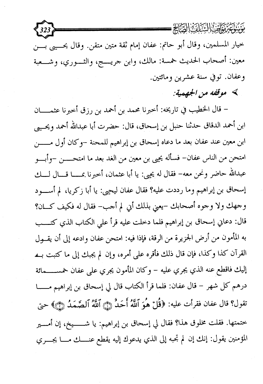 - قال الخطيب في تاريخه: أخبرنا محمد بن أحمد بن رزق أخبرنا عثمان ابن أحمد الدقاق حدثنا حنبل بن إسحاق، قال: حضرت أبا عبد الله أحمد ويحيى ابن معين عند عفان بعد ما دعاه إسحاق بن إبراهيم للمحنة -وكان أول من امتحن من الناس عفان- فسأله يحيى بن معين من الغد بعد ما امتحن -وأبو عبد الله حاضر ونحن معه- فقال له يحيى: يا أبا عثمان، أخبرنا بما قال لك إسحاق بن إبراهيم وما رددت عليه؟ فقال عفان ليحيى: يا أبا زكريا، لم أسود وجهك ولا وجوه أصحابك -يعني بذلك أني لم أجب- فقال له فكيف كان؟ قال: دعاني إسحاق بن إبراهيم فلما دخلت عليه قرأ علي الكتاب الذي كتب به المأمون من أرض الجزيرة من الرقة، فإذا فيه: امتحن عفان وادعه إلى أن يقول القرآن كذا وكذا، فإن قال ذلك فأقره على أمره، وإن لم يجبك إلى ما كتبت به إليك فاقطع عنه الذي يجري عليه - وكان المأمون يجري على عفان خمسمائة درهم كل شهر - قال عفان: فلما قرأ الكتاب قال لي إسحاق بن إبراهيم ما تقول؟ قال عفان فقرأت عليه: {قُلْ هُوَ اللَّهُ أَحَدٌ (1) اللَّهُ الصَّمَدُ} حتى ختمتها. فقلت مخلوق هذا؟ فقال لي إسحاق بن إبراهيم: يا شيخ، إن أمير المؤمنين يقول: إنك إن لم تجبه إلى الذي يدعوك إليه يقطع عنك ما يجري