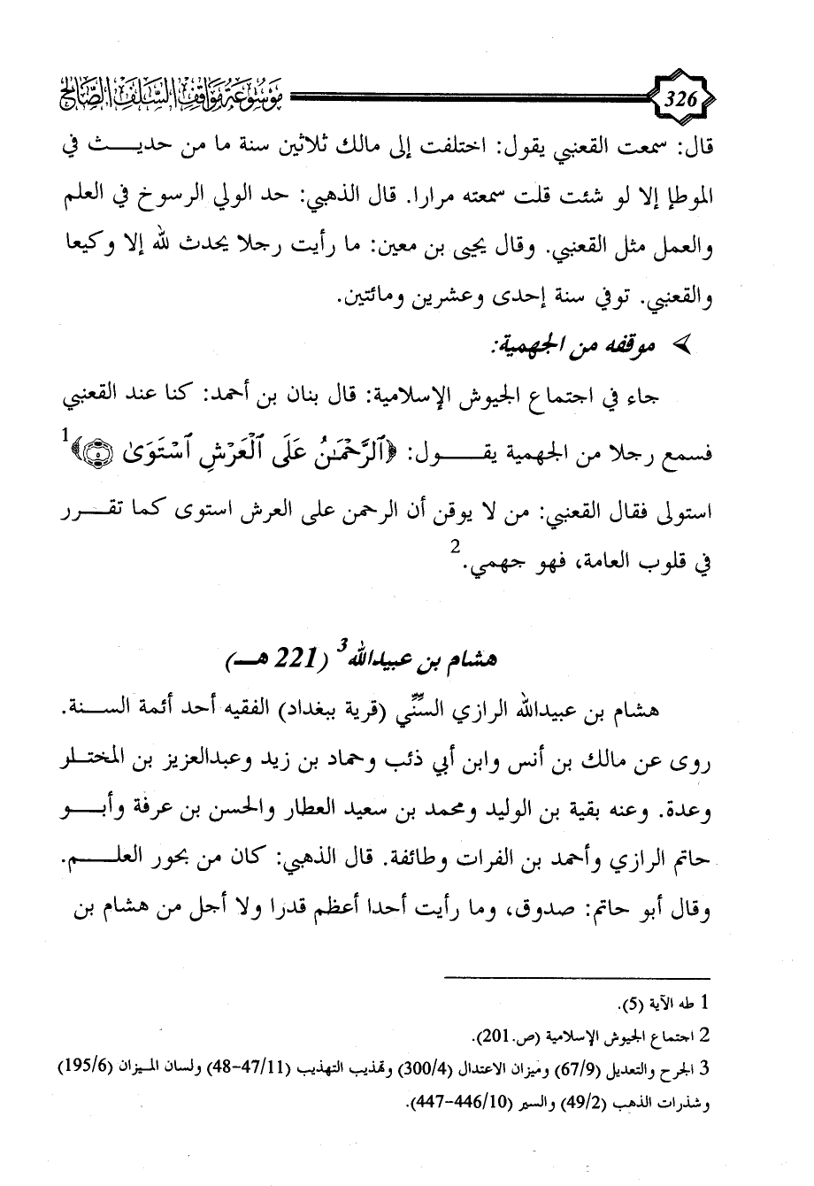 جاء في اجتماع الجيوش الإسلامية: قال بنان بن أحمد: كنا عند القعنبي فسمع رجلا من الجهمية يقول: {الرَّحْمَنُ على الْعَرْشِ استوى} (¬1) استولى فقال القعنبي: من لا يوقن أن الرحمن على العرش استوى كما تقرر في قلوب العامة، فهو جهمي. (¬2)